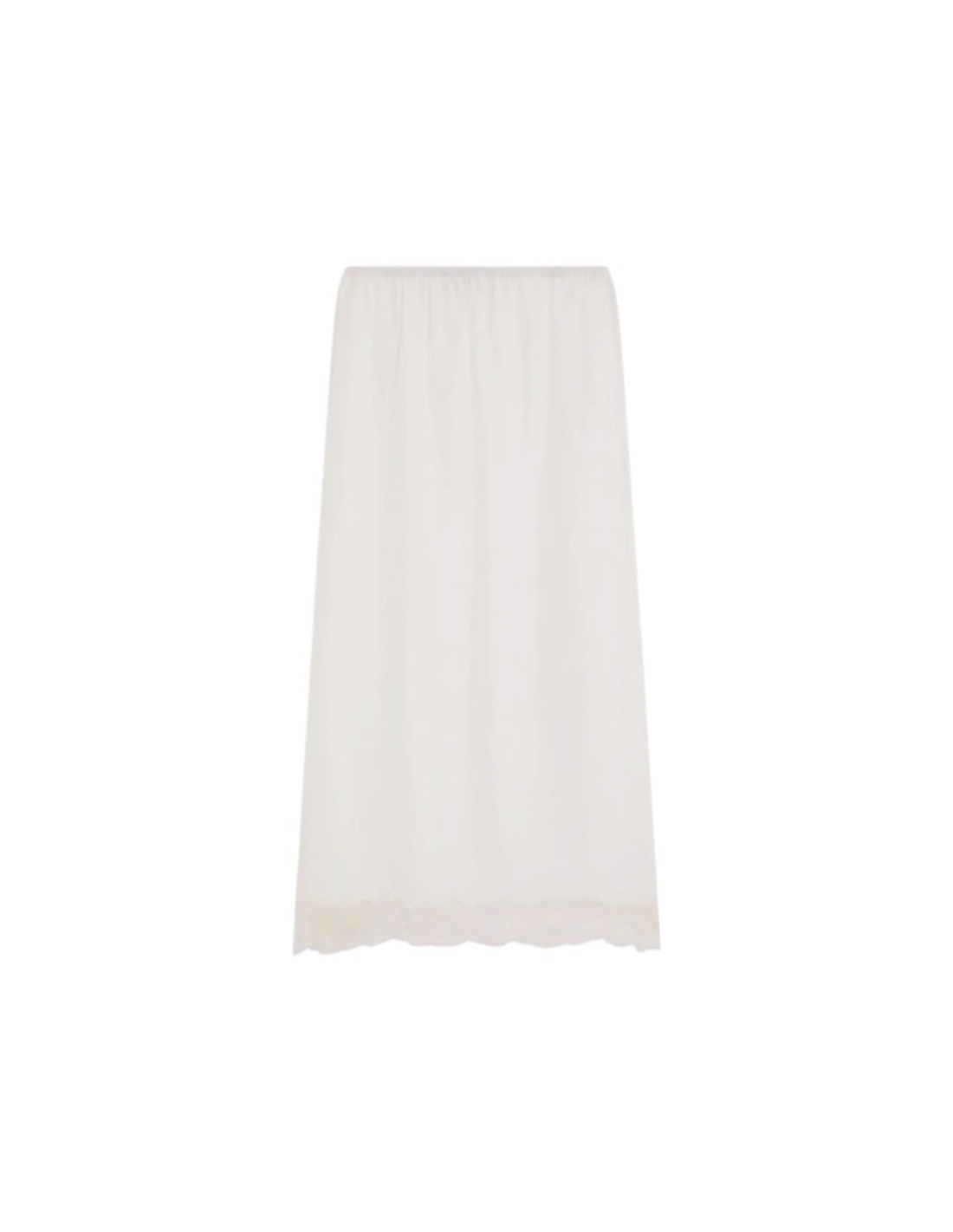 Modèle iconique du vestiaire Roseanna, coupe près du corps, taille élastiquée, fentes côtés, longueur cheville et bas de vêtement en dentelle festonnée.