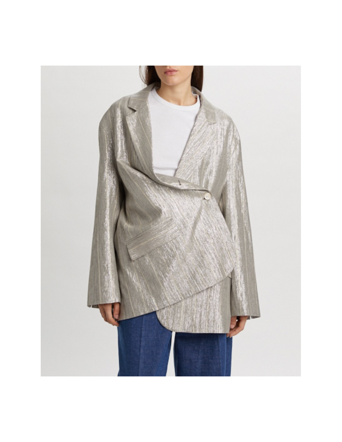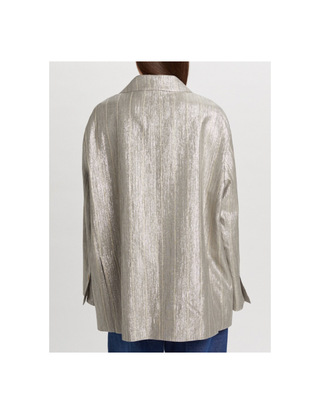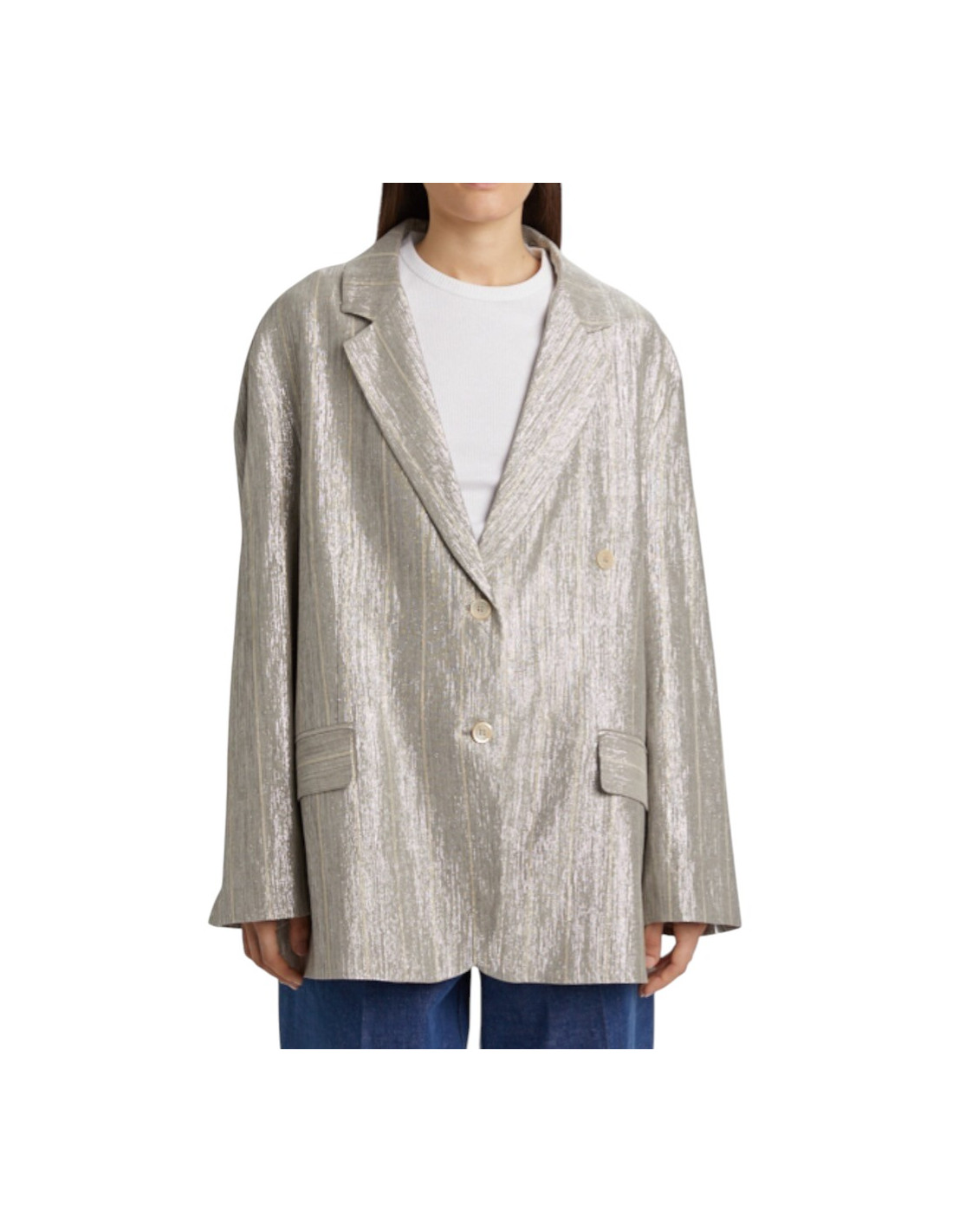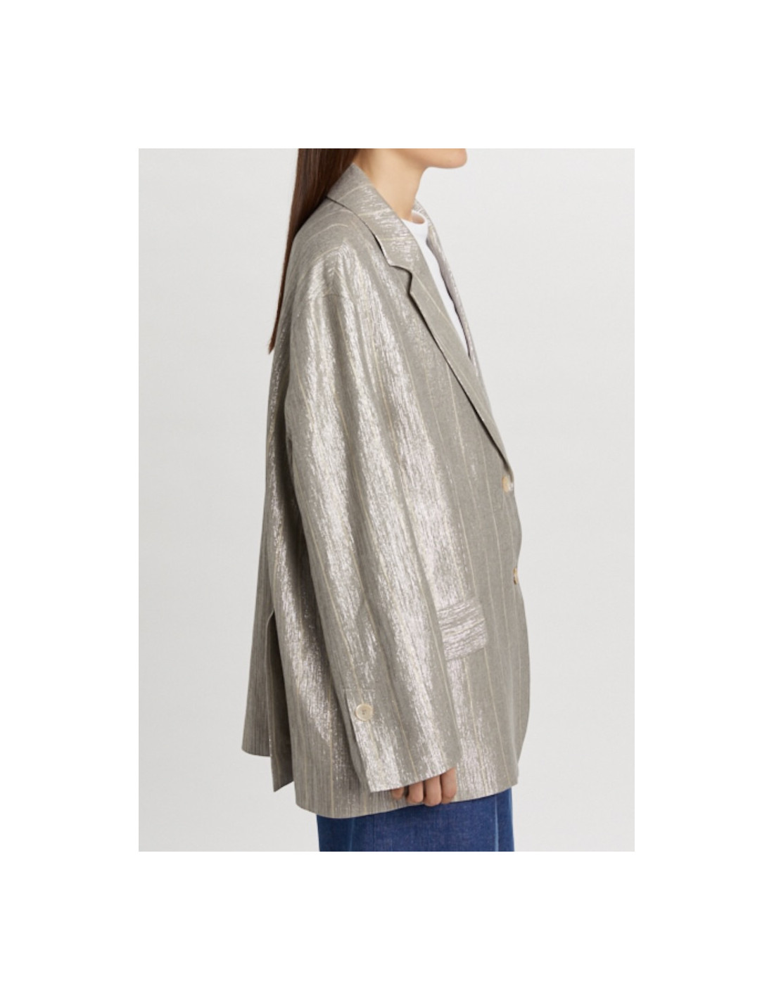 Blazer couleur argent oversize en lin et lurex. Subtiles rayures beiges