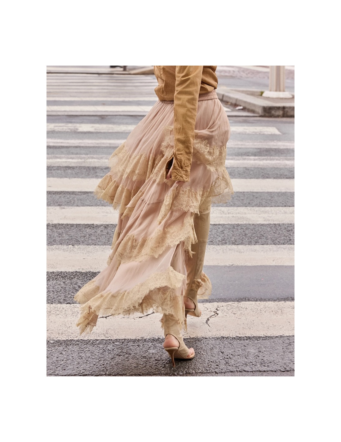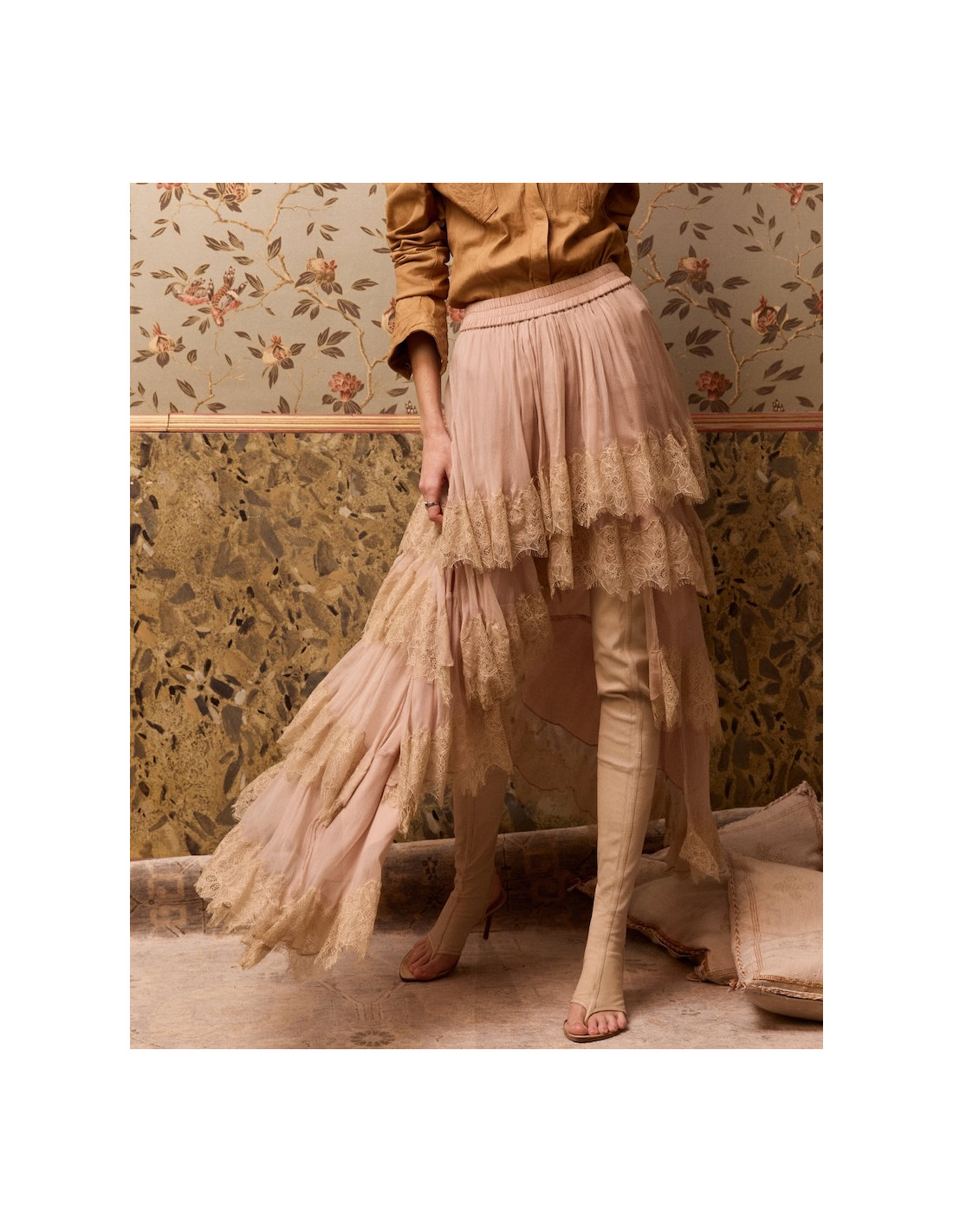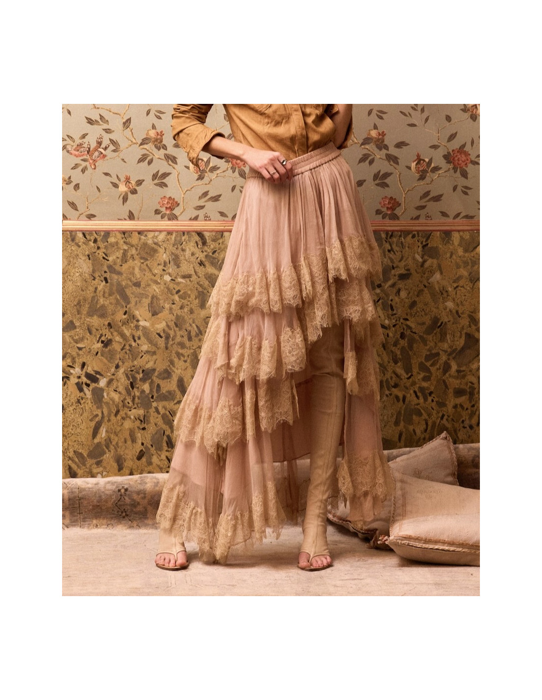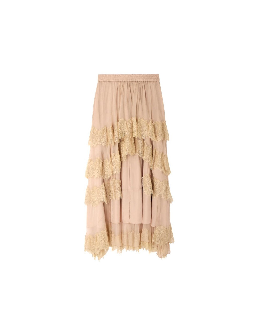 Jupe asymétrique en viscose et dentelle nude et ivoire