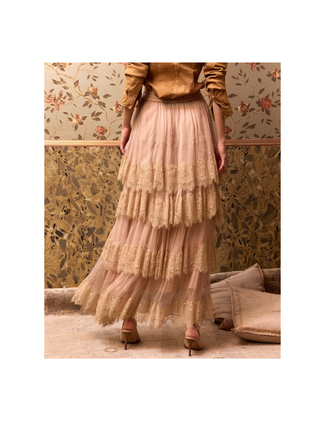 Jupe longue en viscose chiffon noire avec volants soulignés de dentelle sur chaque niveau