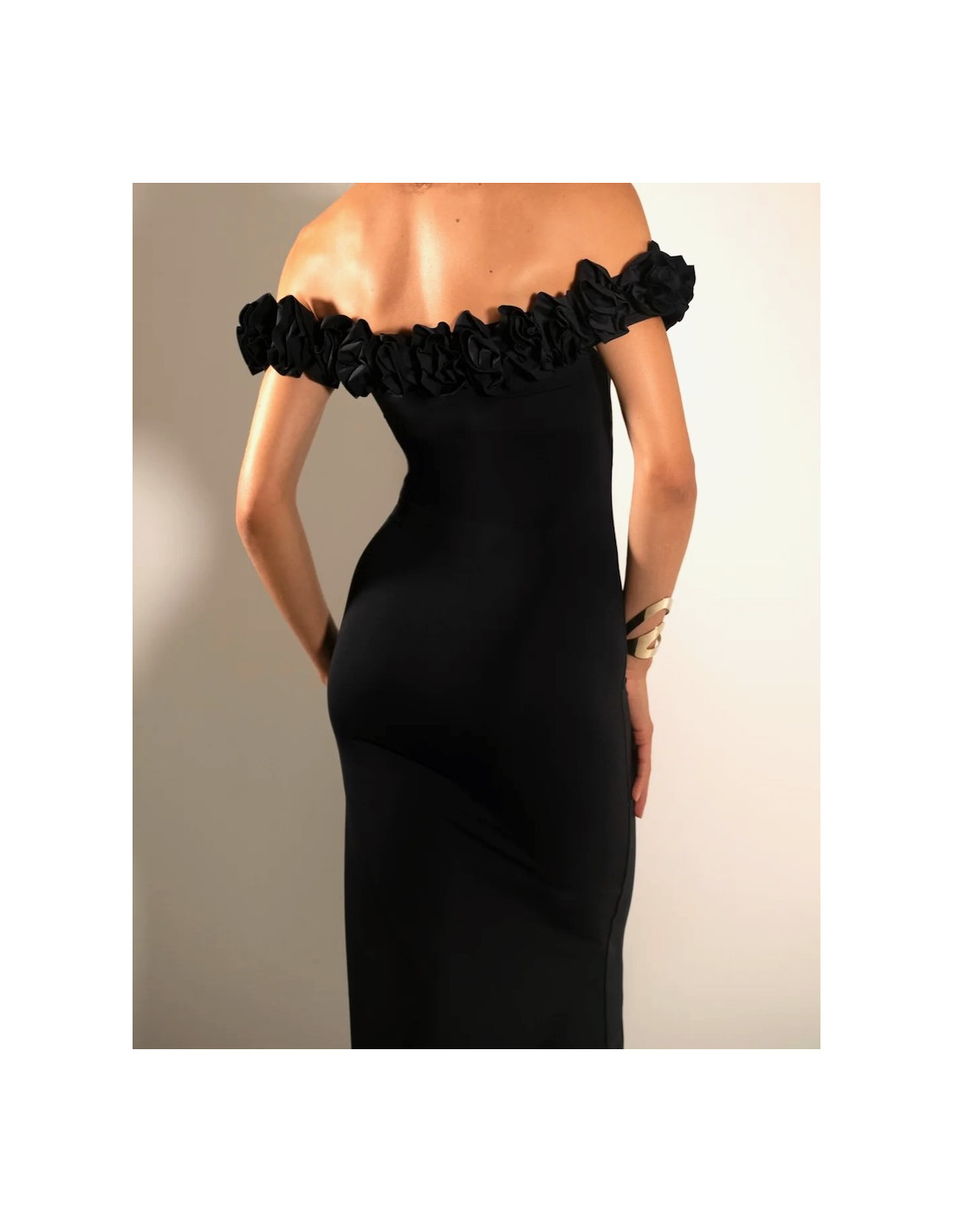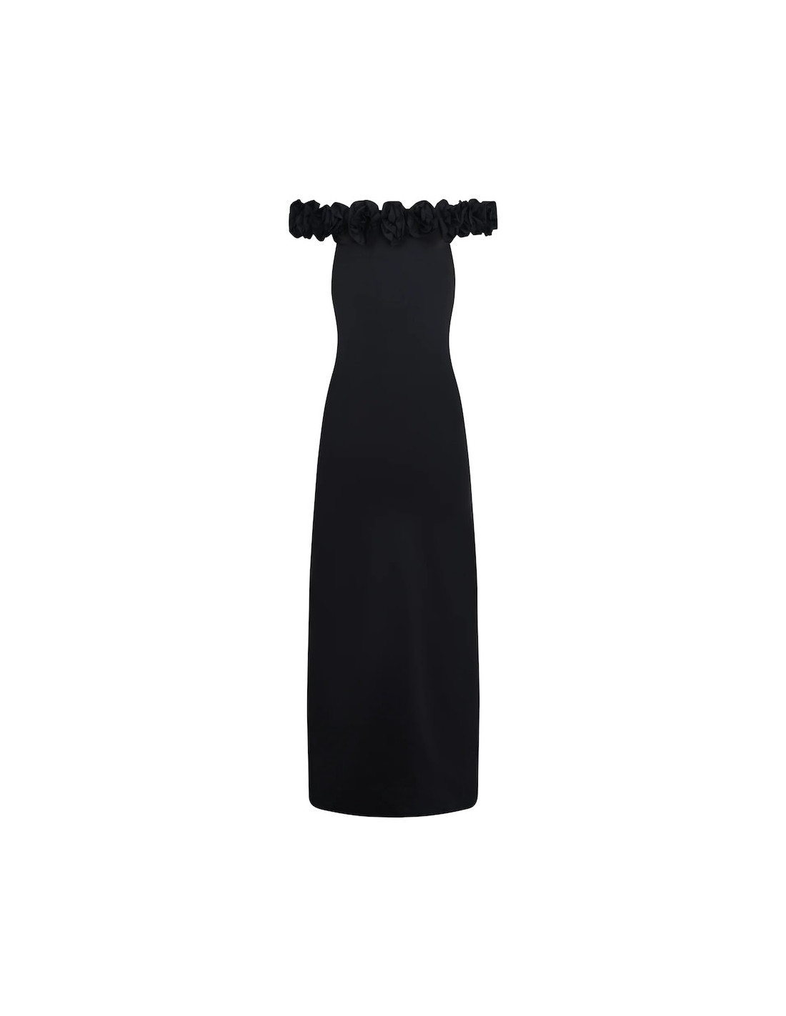 Pensée pour sublimer la silhouette avec minimalisme et raffinement, cette robe noire fluide se distingue par son encolure parée de fleurs délicatement façonnées, signature poétique du modèle Bégonia.