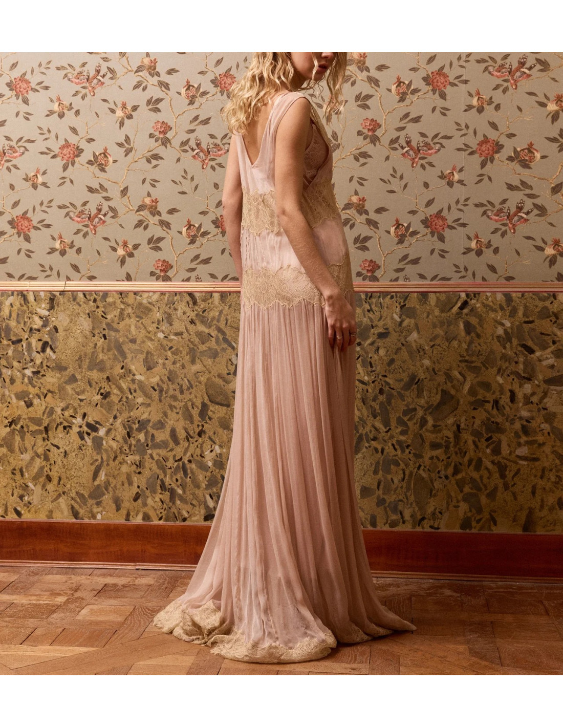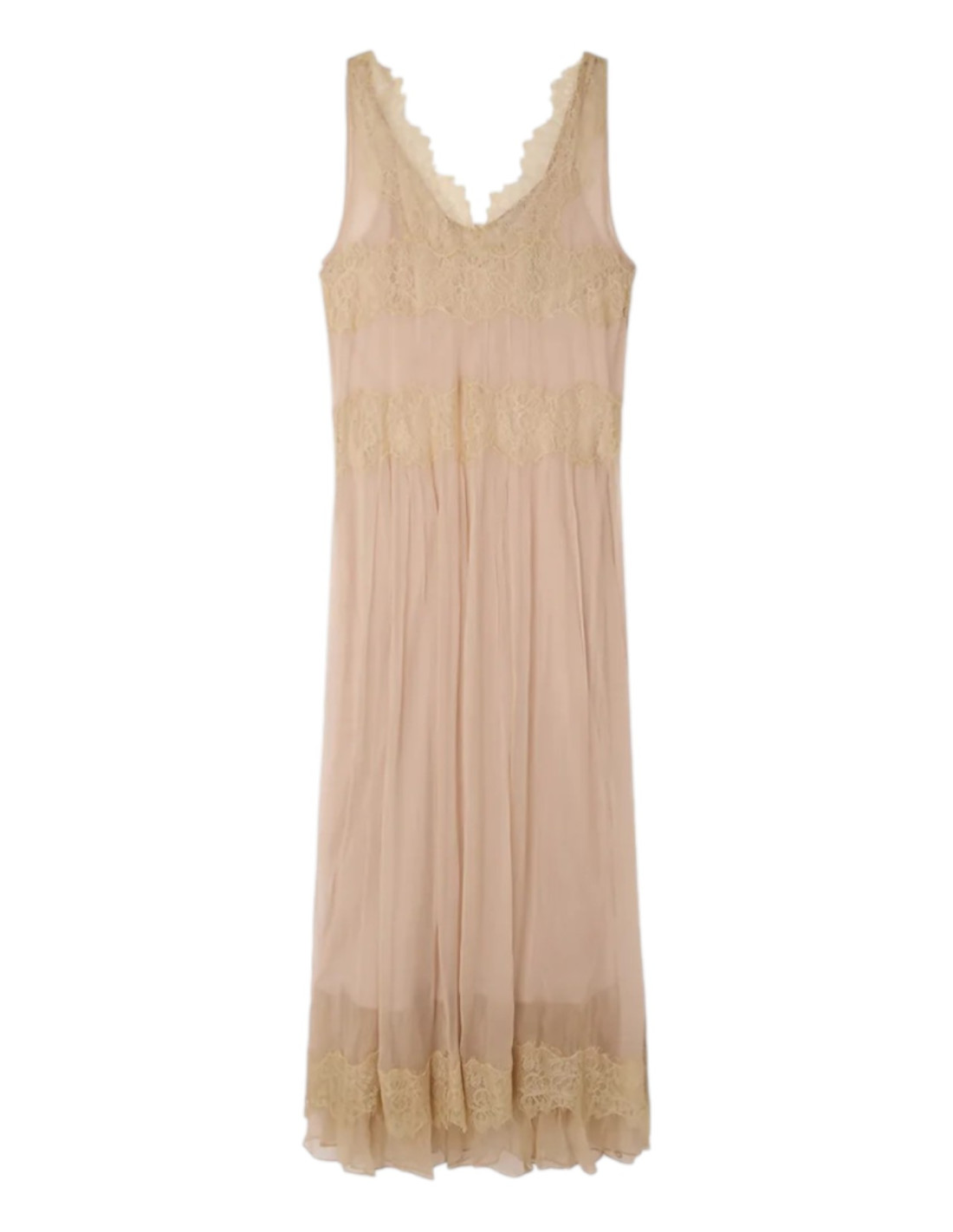 Robe fluide en viscose et dentelle rose beige délicatement transparente