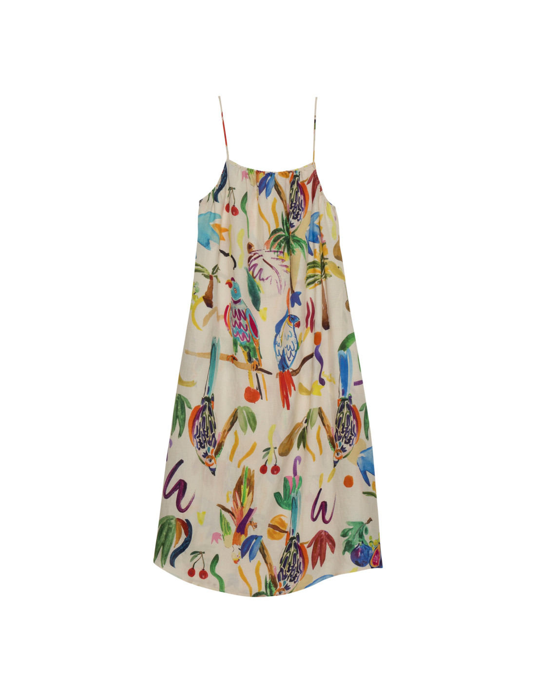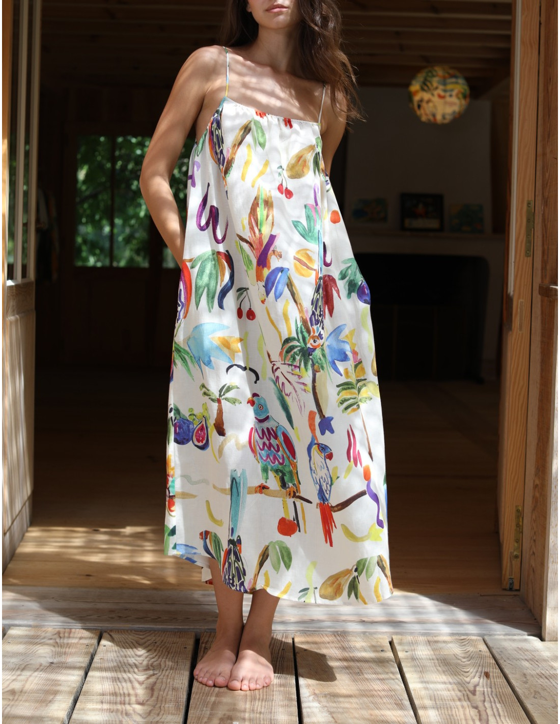 Robe longue à fines bretelles en lin et viscose imprimé multicolore.