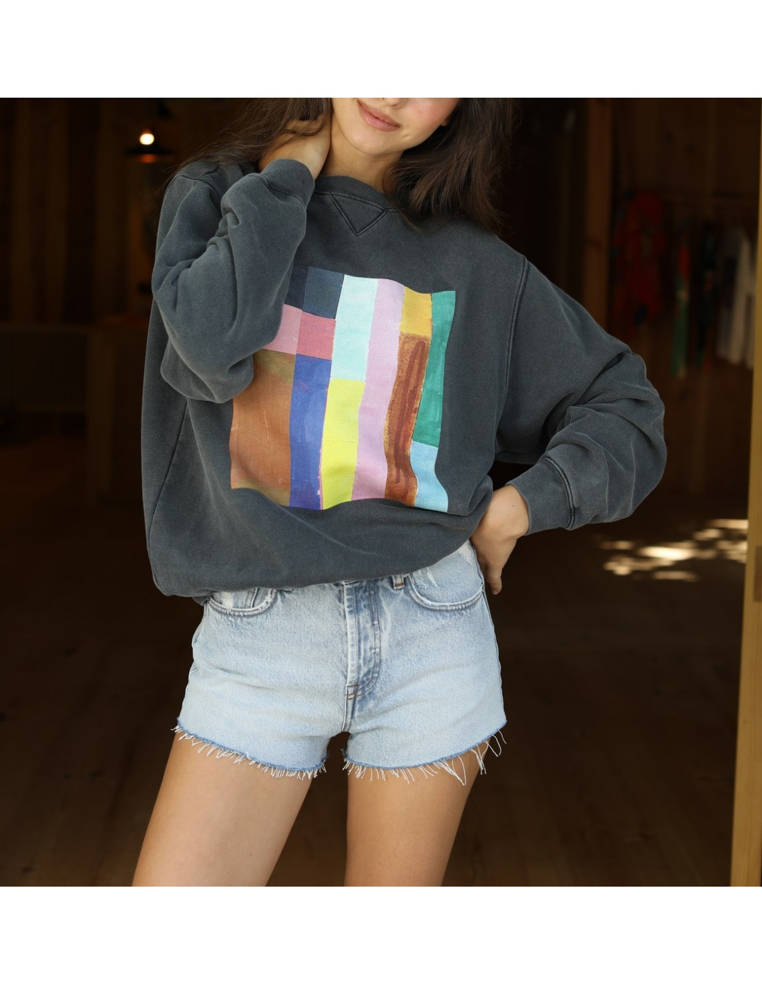 Sweatshirt gris foncé imprimé multicolore