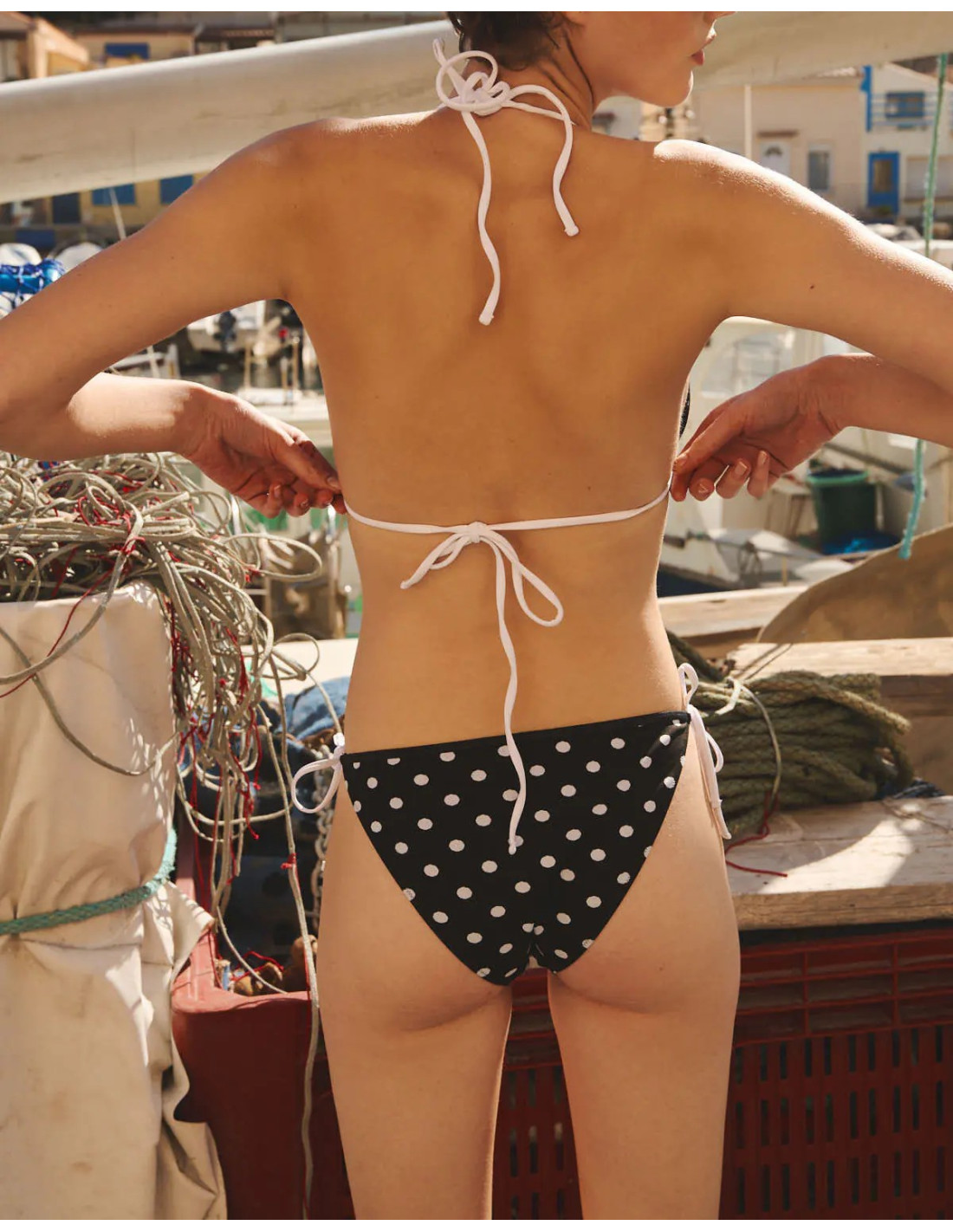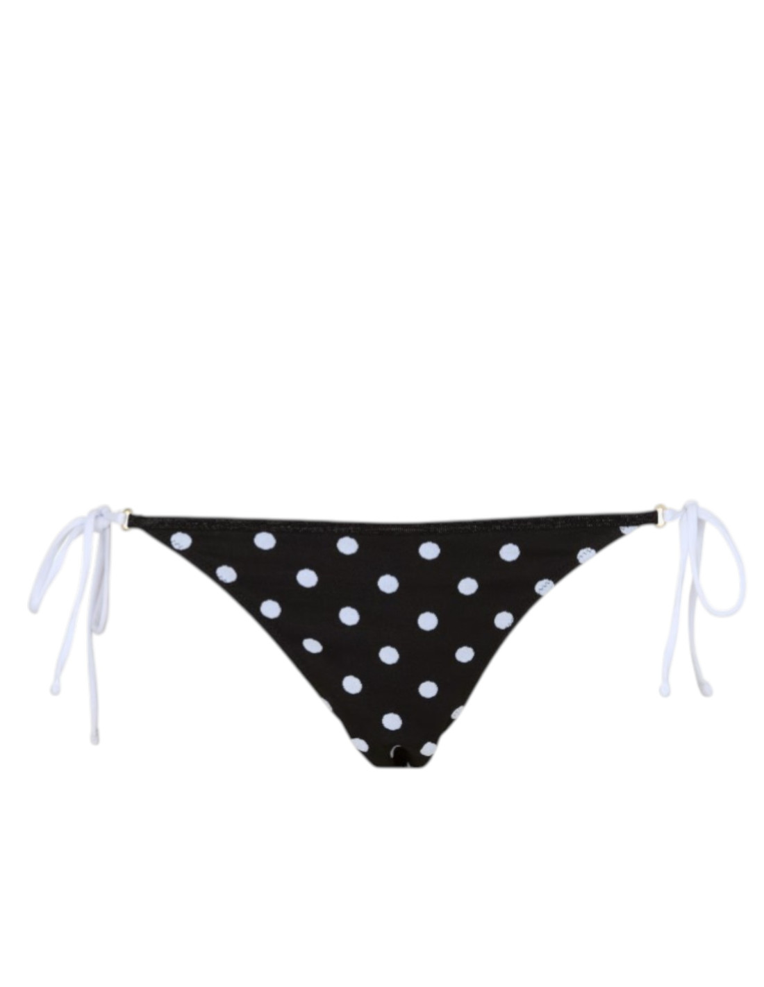 Bas de maillot de bain noir à pois blancs avec bord lurex noir et liens blancs