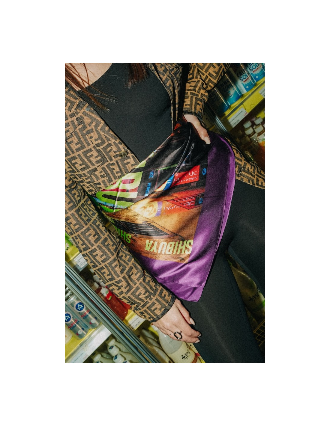 Carré de soie imprimé quartier Shibuya de Tokyo au Japon, bords et écritures contrastés.