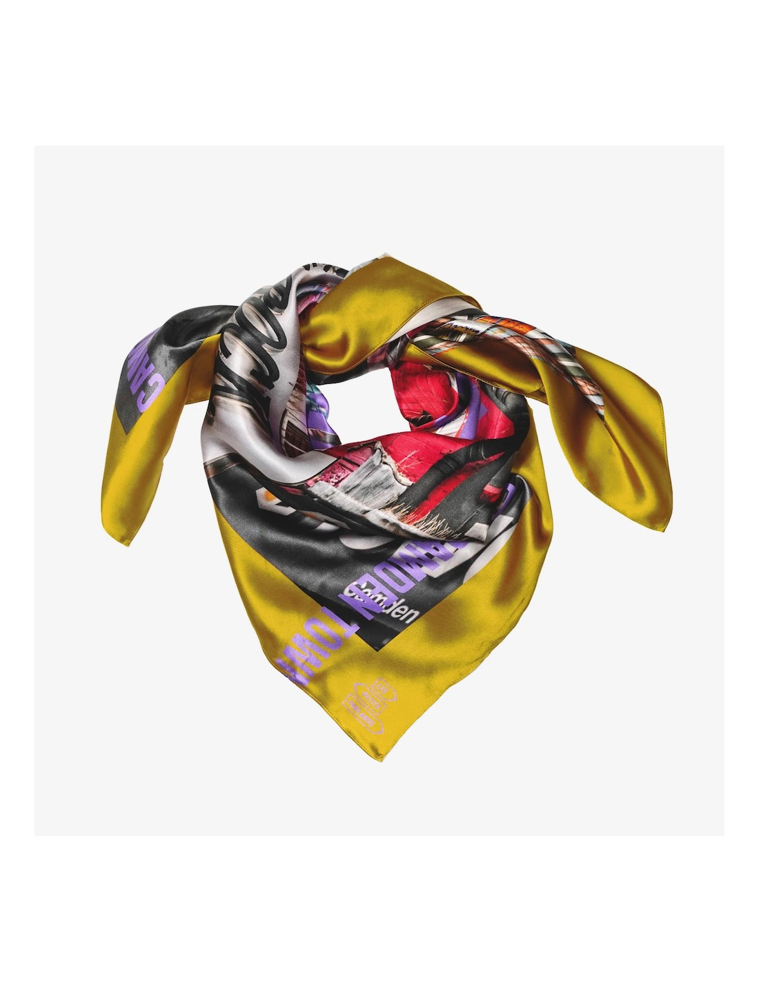 Carré de soie imprimé quartier CAMDEN TOWN de LONDRES, bords et écritures contrastés.