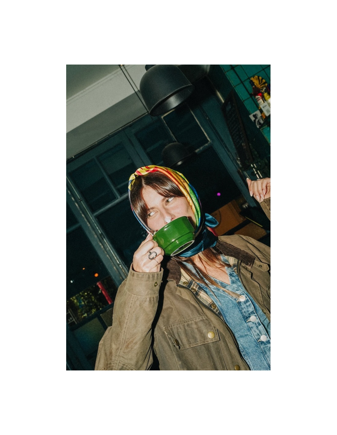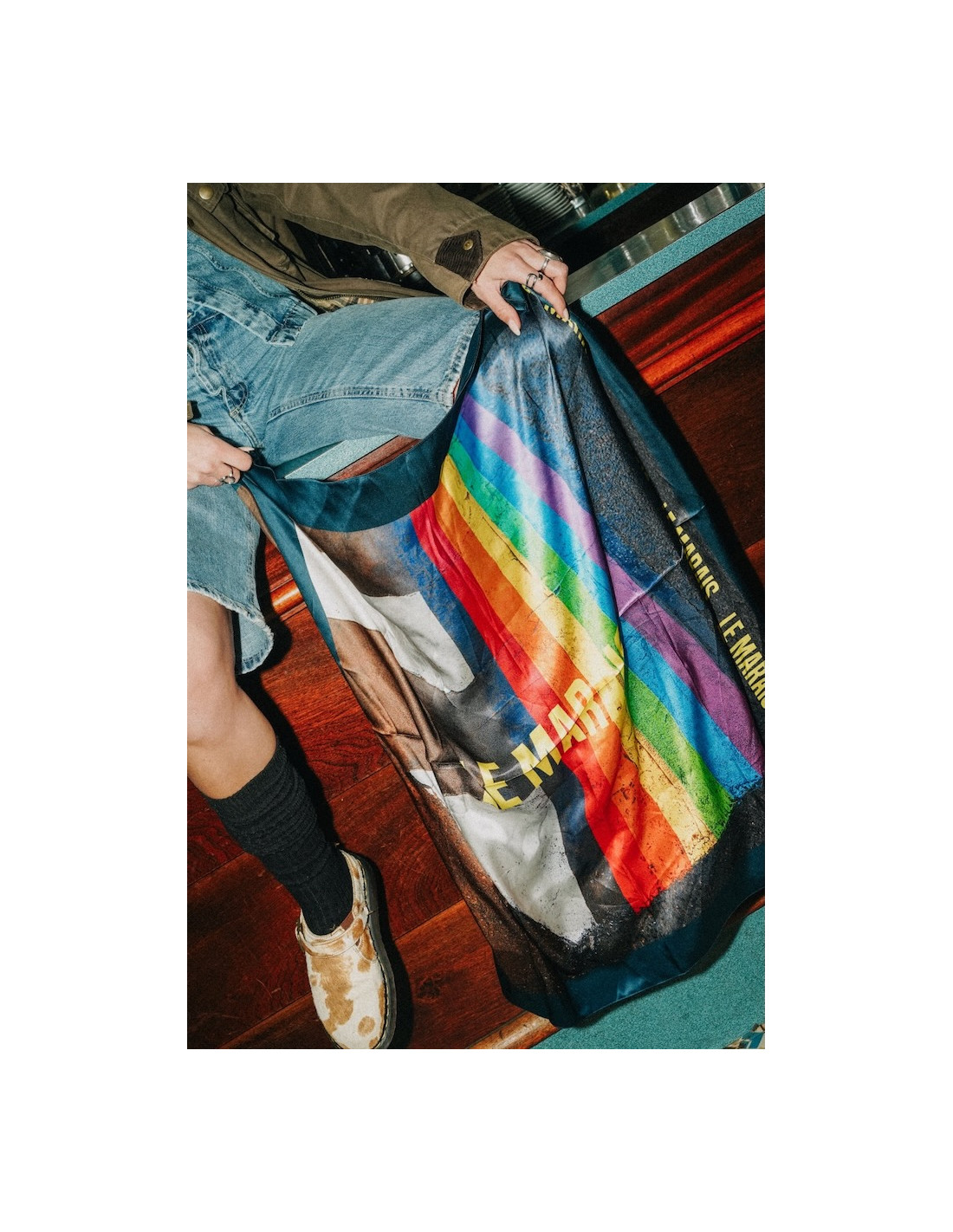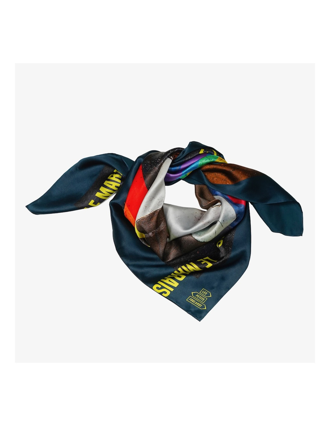 Carré de soie imprimé quartier LE MARAIS à Paris, bords et écritures contrastés.