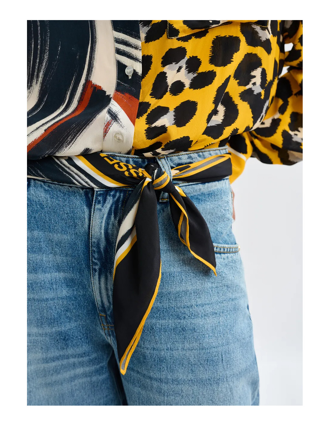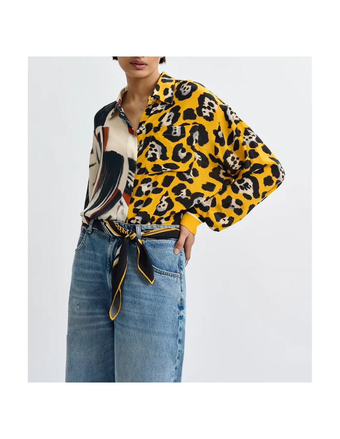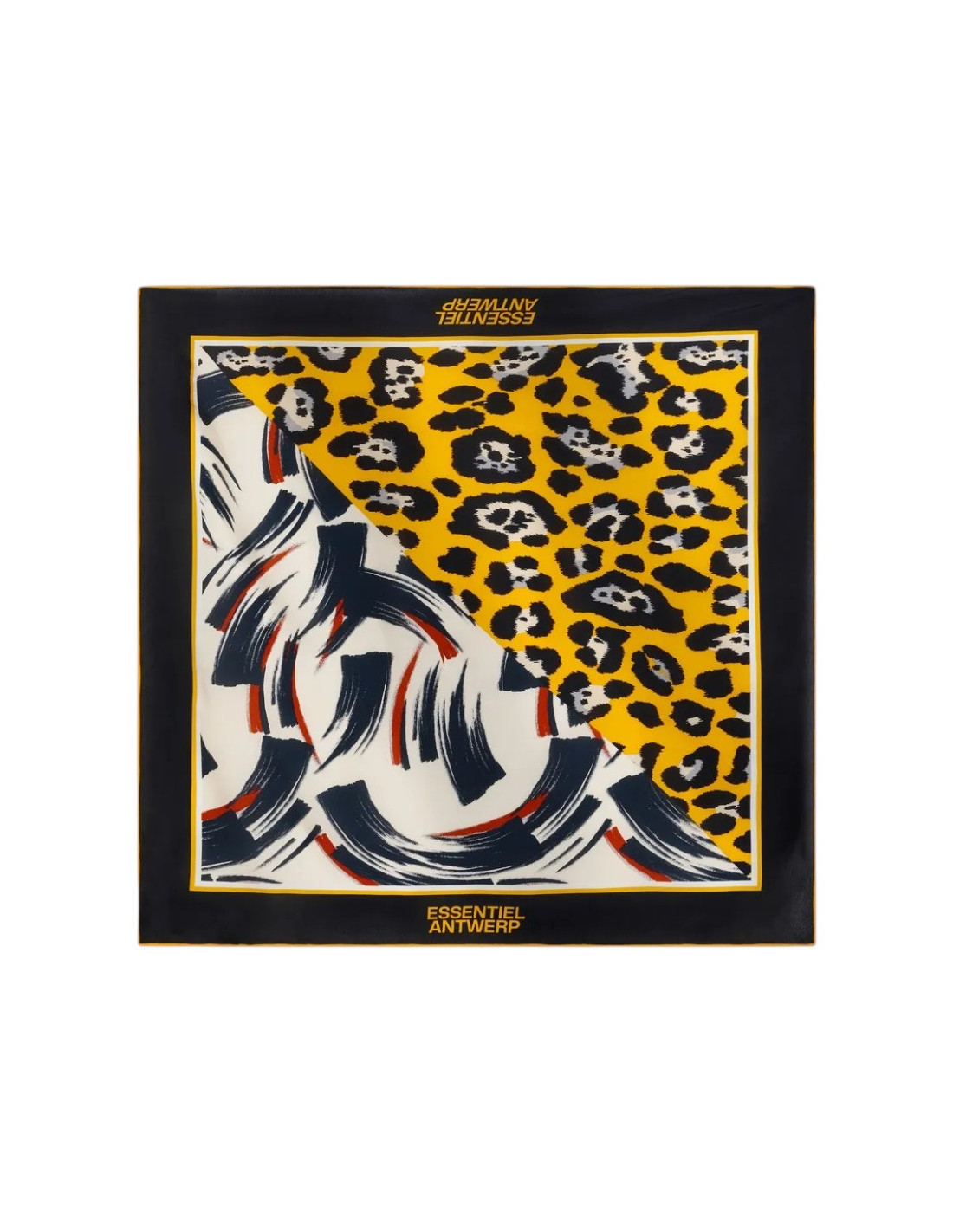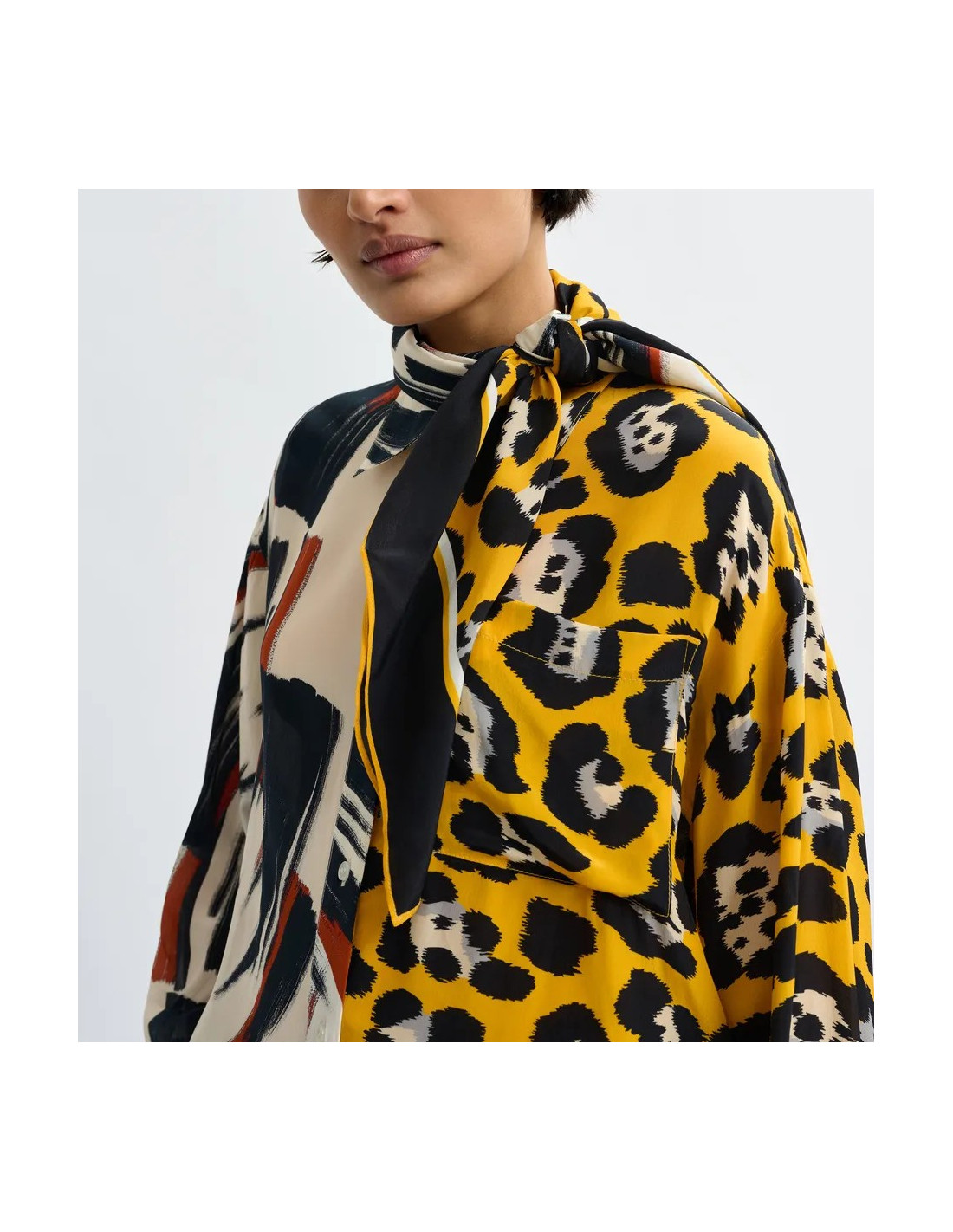 Foulard léger avec imprimé placé multicolore, moitié léopard et moitié imprimé artistique de traits de pinceau