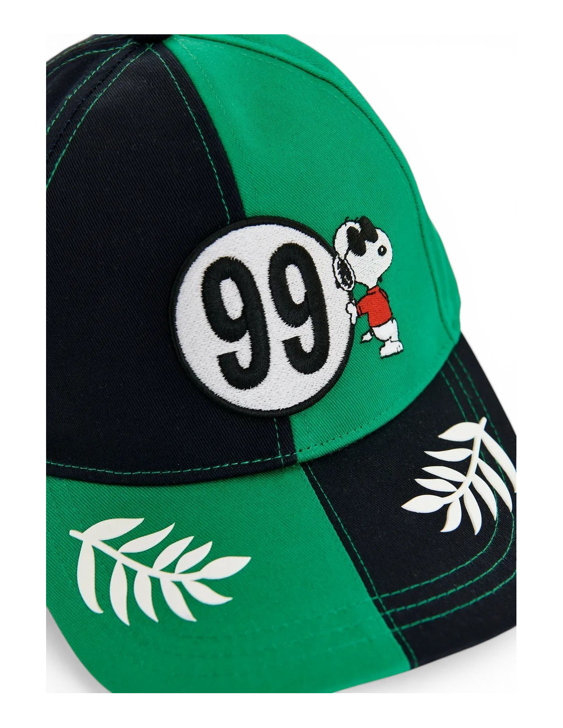 Casquette en coton vert, noir et blanc avec écusson Snoopy rehaussé d'un motif 99 sur le devant