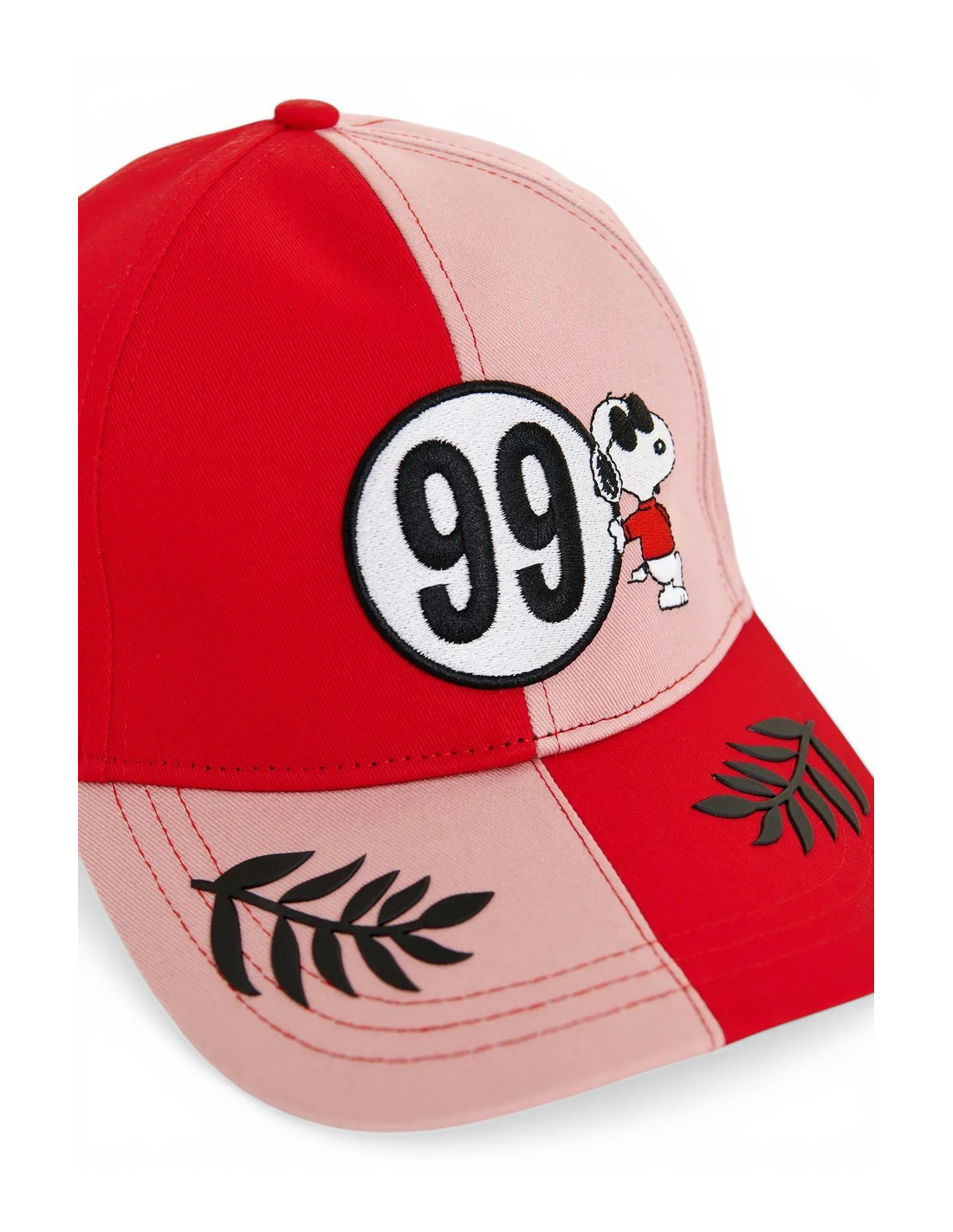 Casquette en coton rouge, rose, noir et blanc avec écusson Snoopy rehaussé d'un motif 99 sur le devant