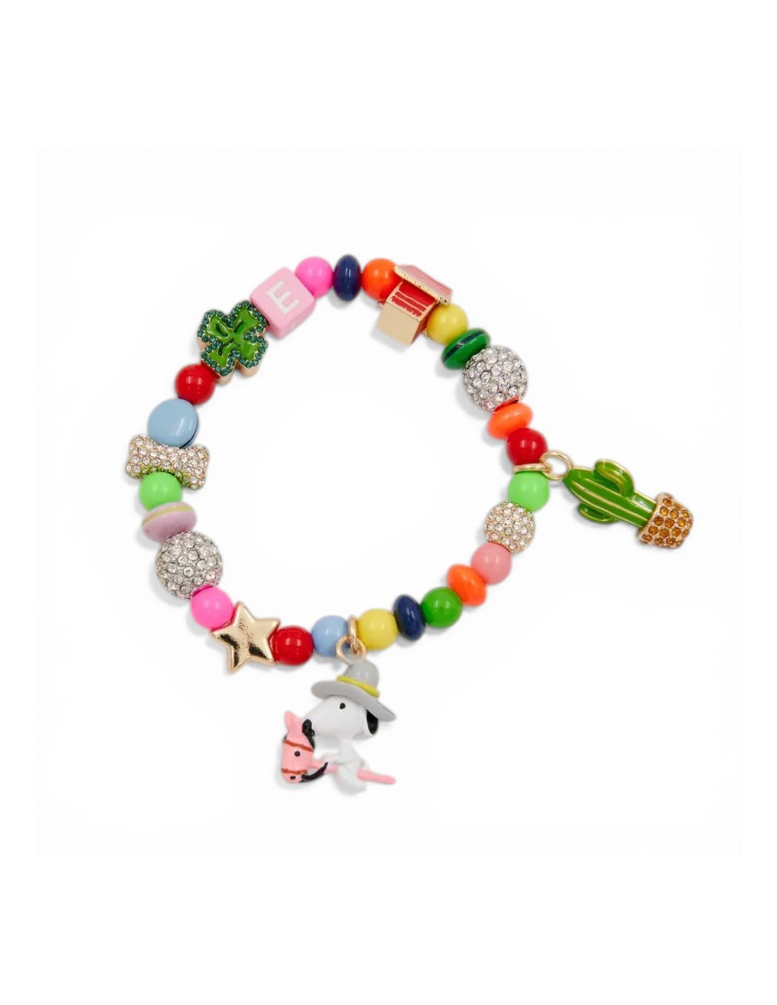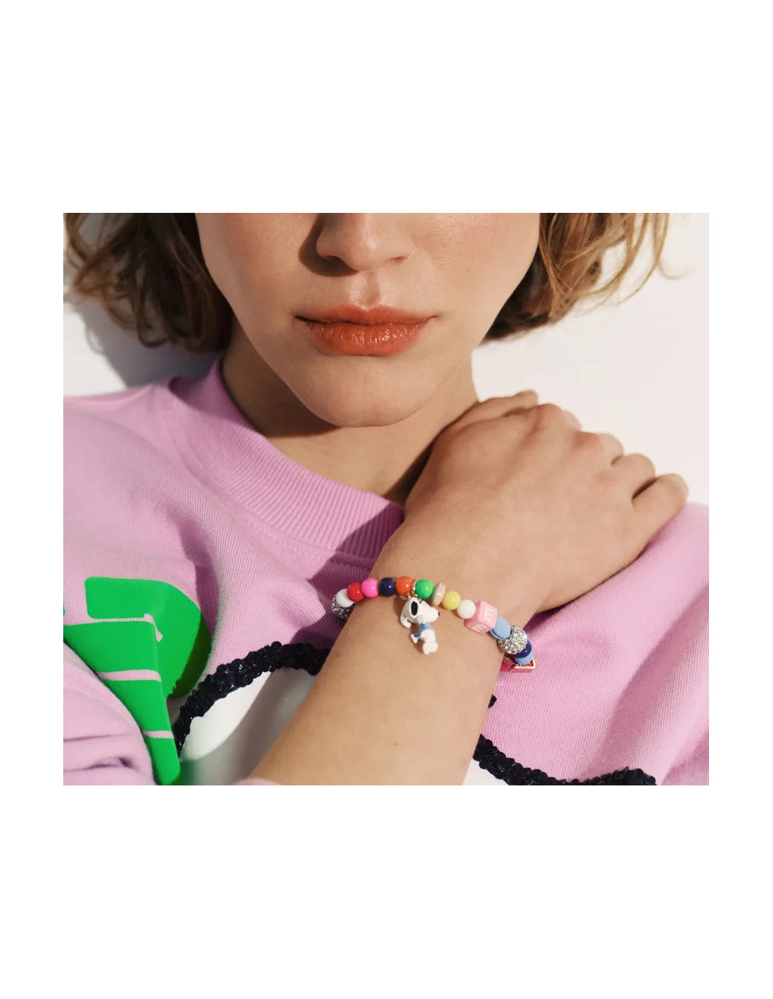 Bracelet sur cordon élastique composé de perles fantaisie multicolores et strassées avec breloques personnages Peanuts™ Snoopy