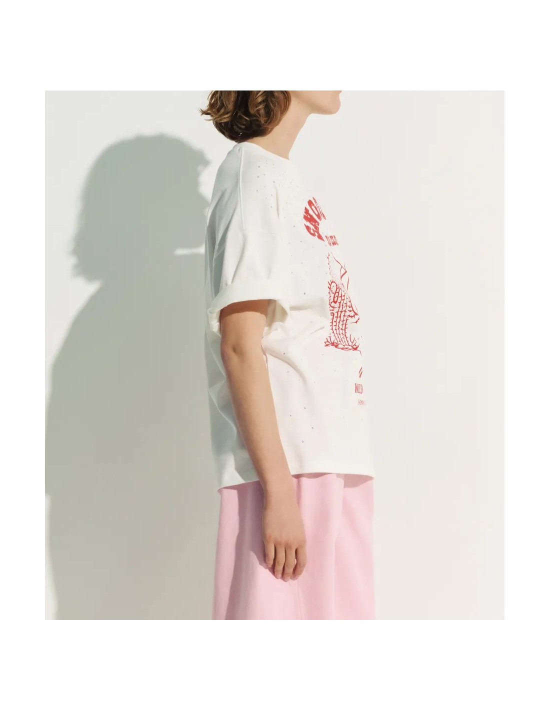 T-Shirt en coton blanc cassé avec strass et imprimé rouge Peanuts™ Snoopy sur le devant