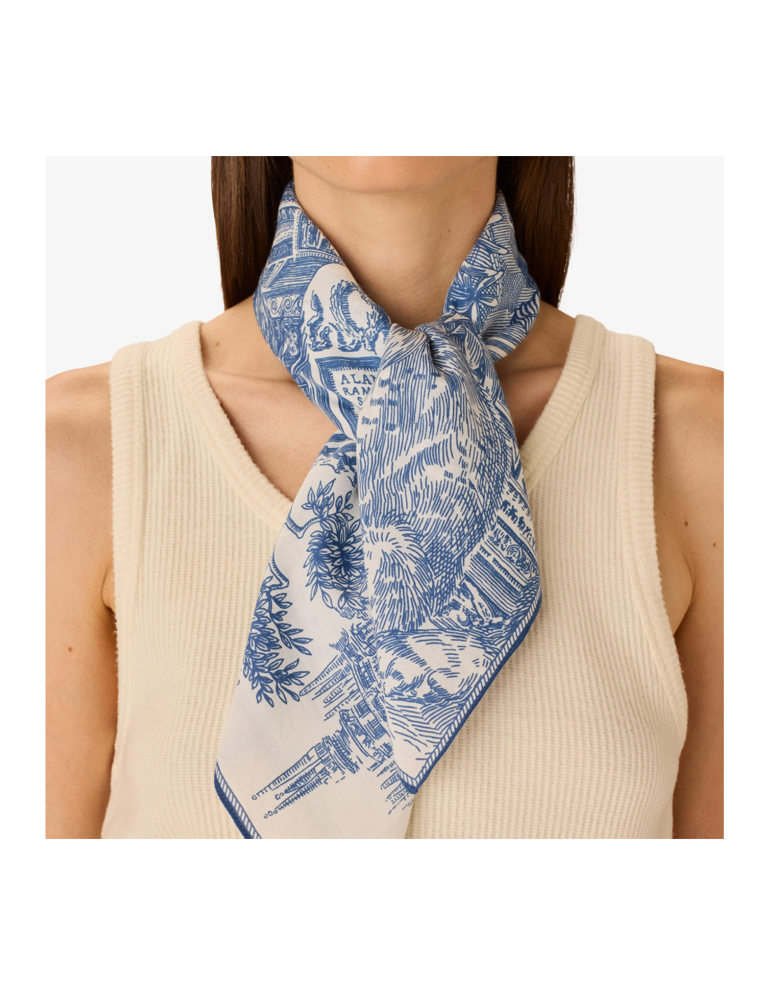 Classique carré bleu, en coton et soie, de la collection Piranesi, à nouer autour du cou ou dans les cheveux