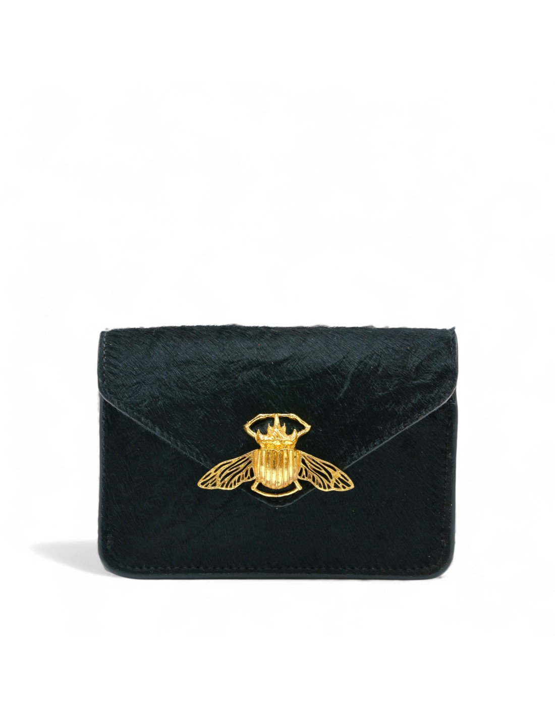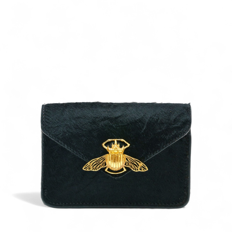 Petite pochette forme enveloppe en cuir noir façon astrakan avec fermoir scarabée doré