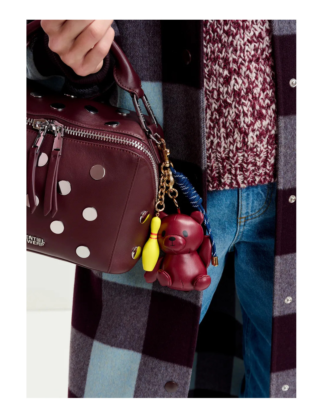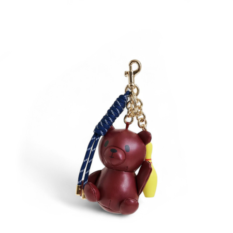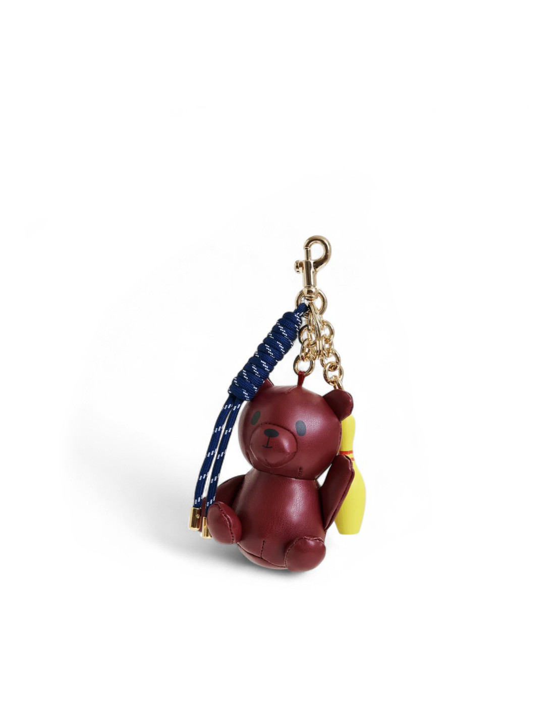 Bijou de sac composé d'un ourson en simili cuir bordeaux, d'une petite quille de bowling jaune et d'un cordon torsadé.