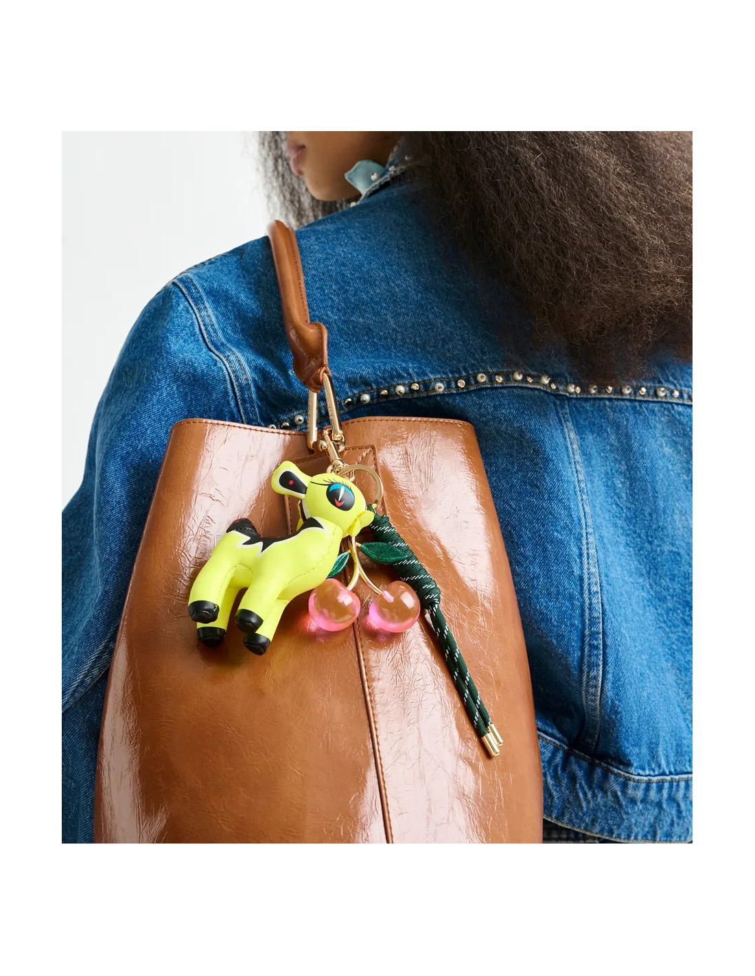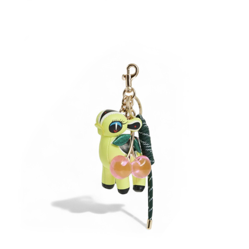Bijou de sac composé d'un petit cerf version dessin animé en simili cuir jaune, d'un duo de cerises en résine brillante et d'un cordon torsadé.