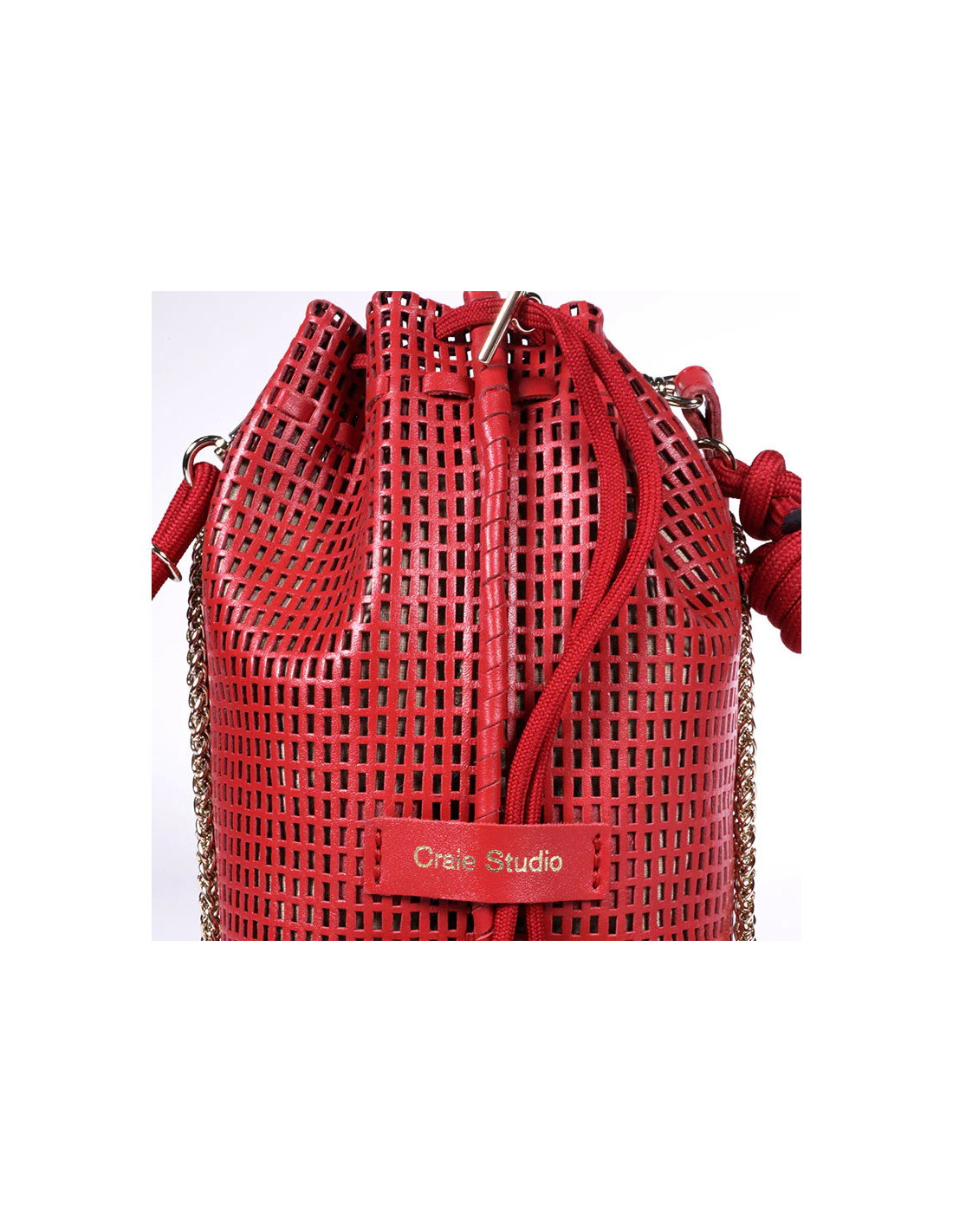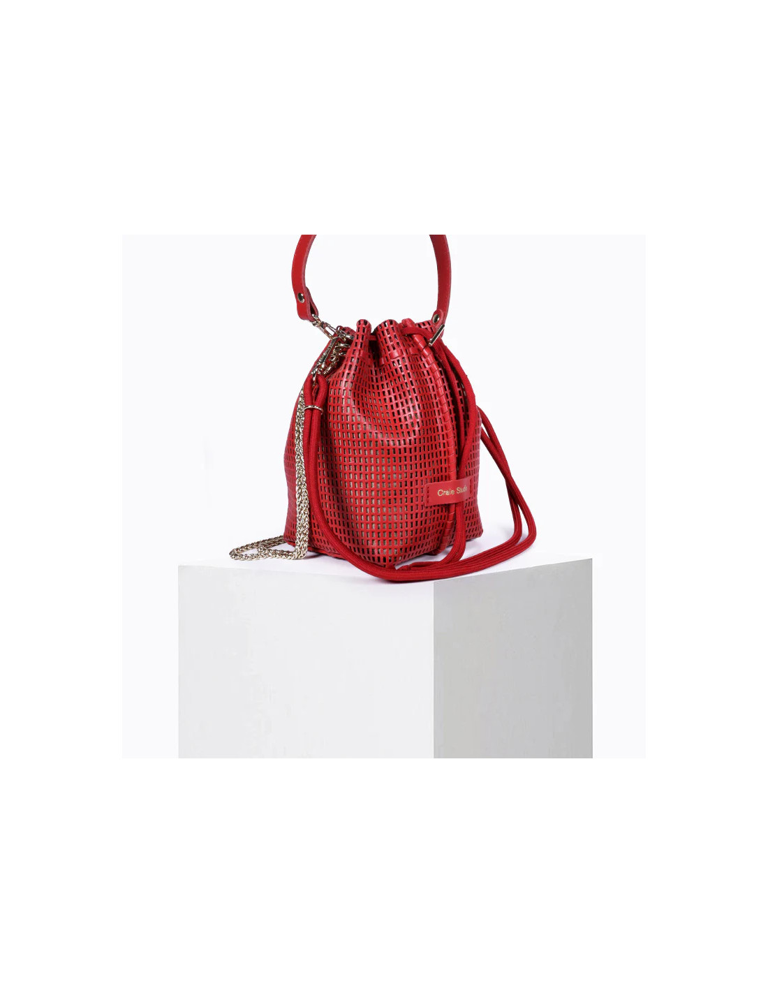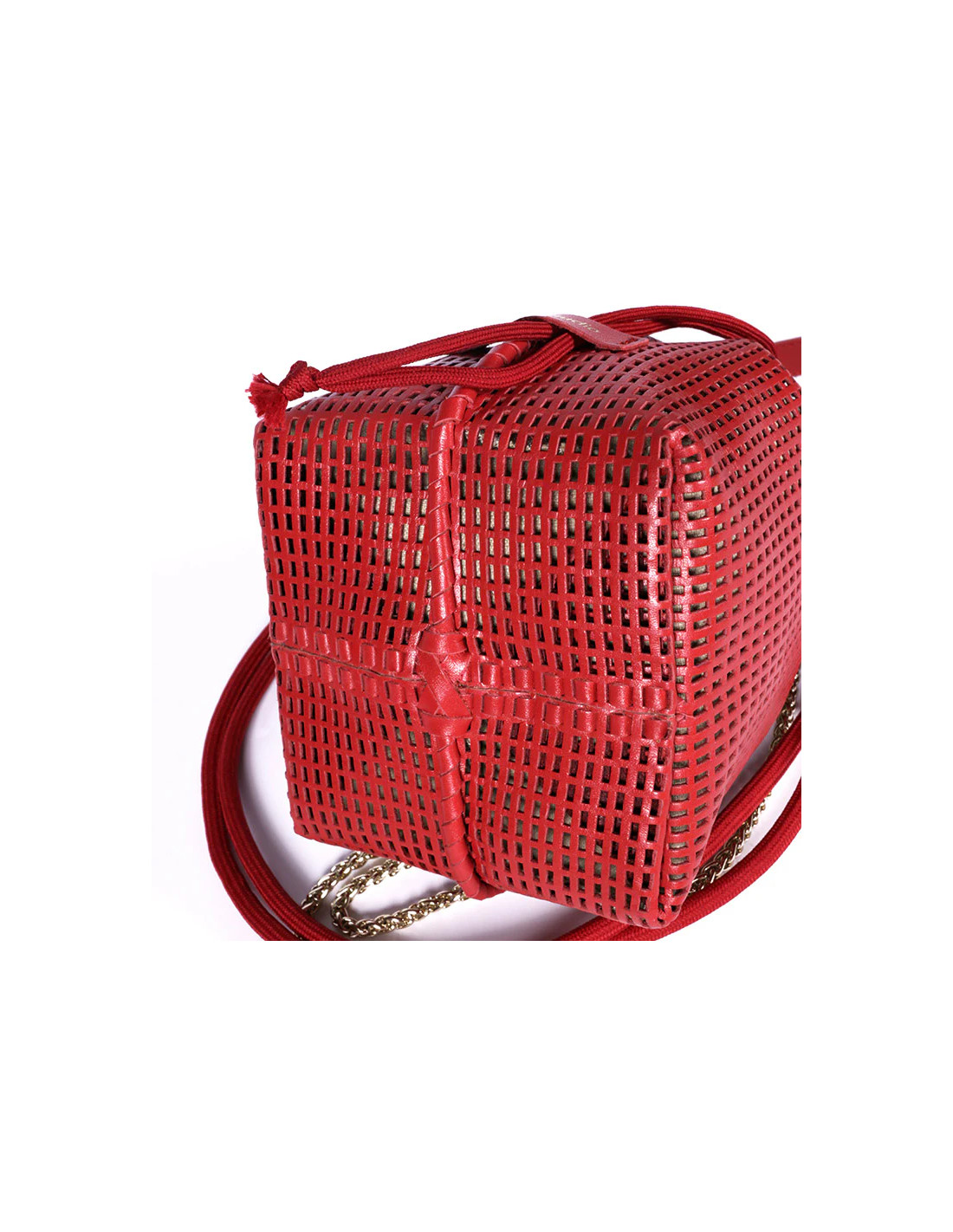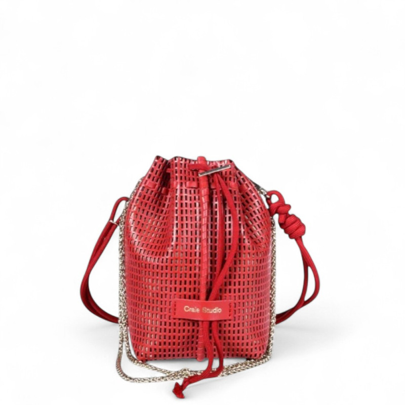 Mini sac seau en cuir de veau perforé rouge cousu main et doublé en coton bio