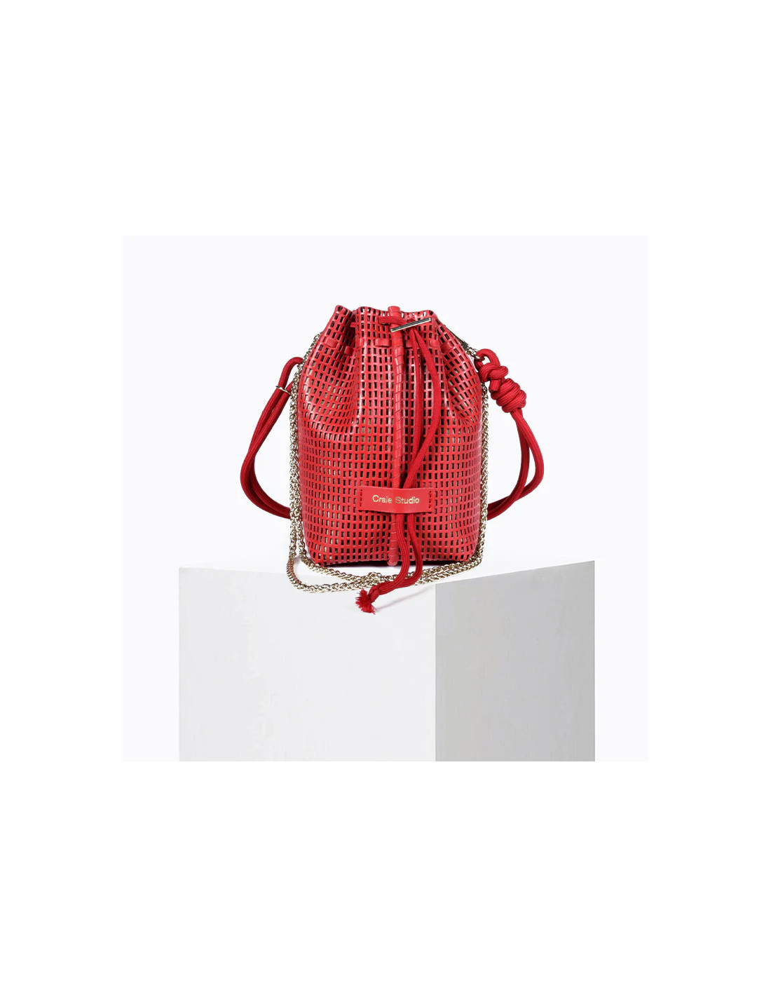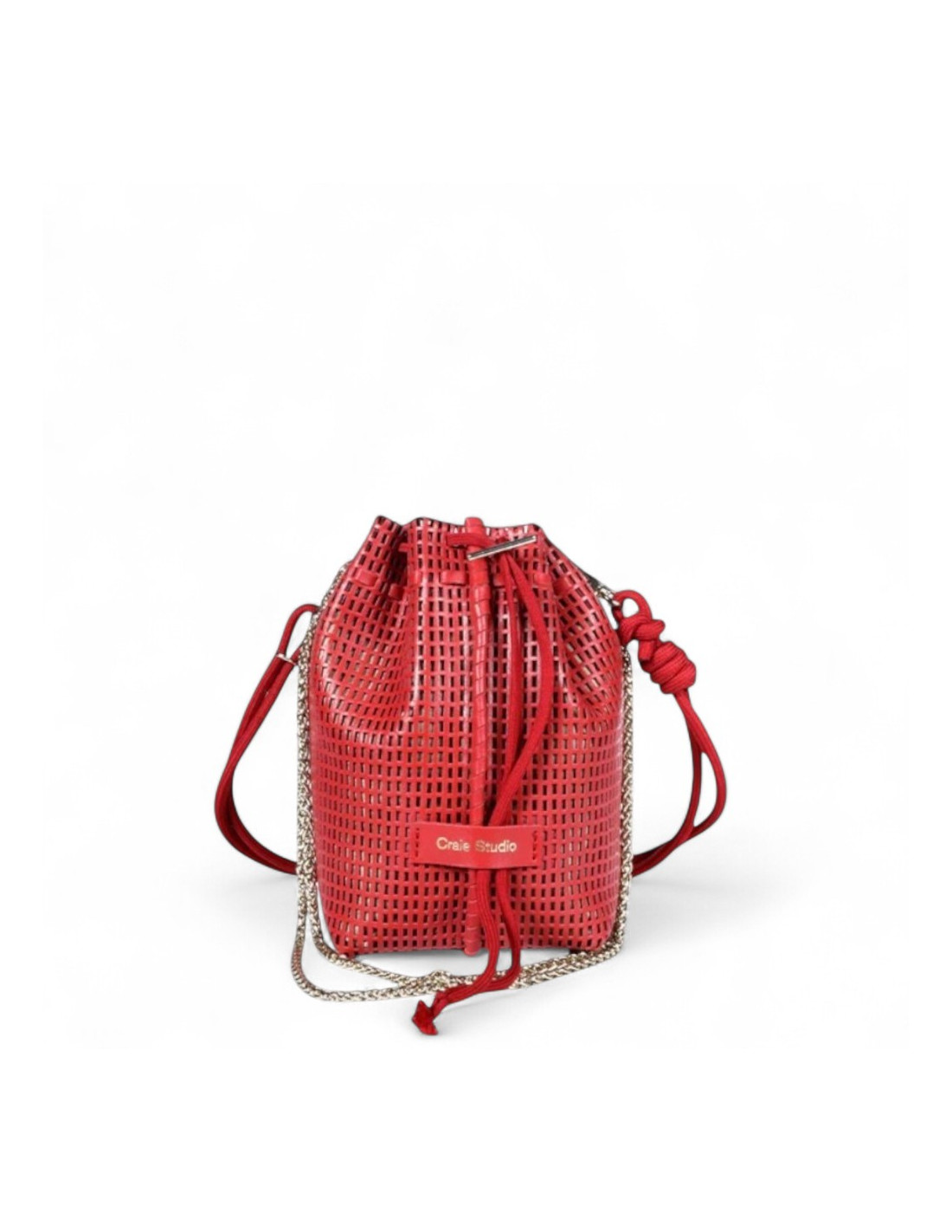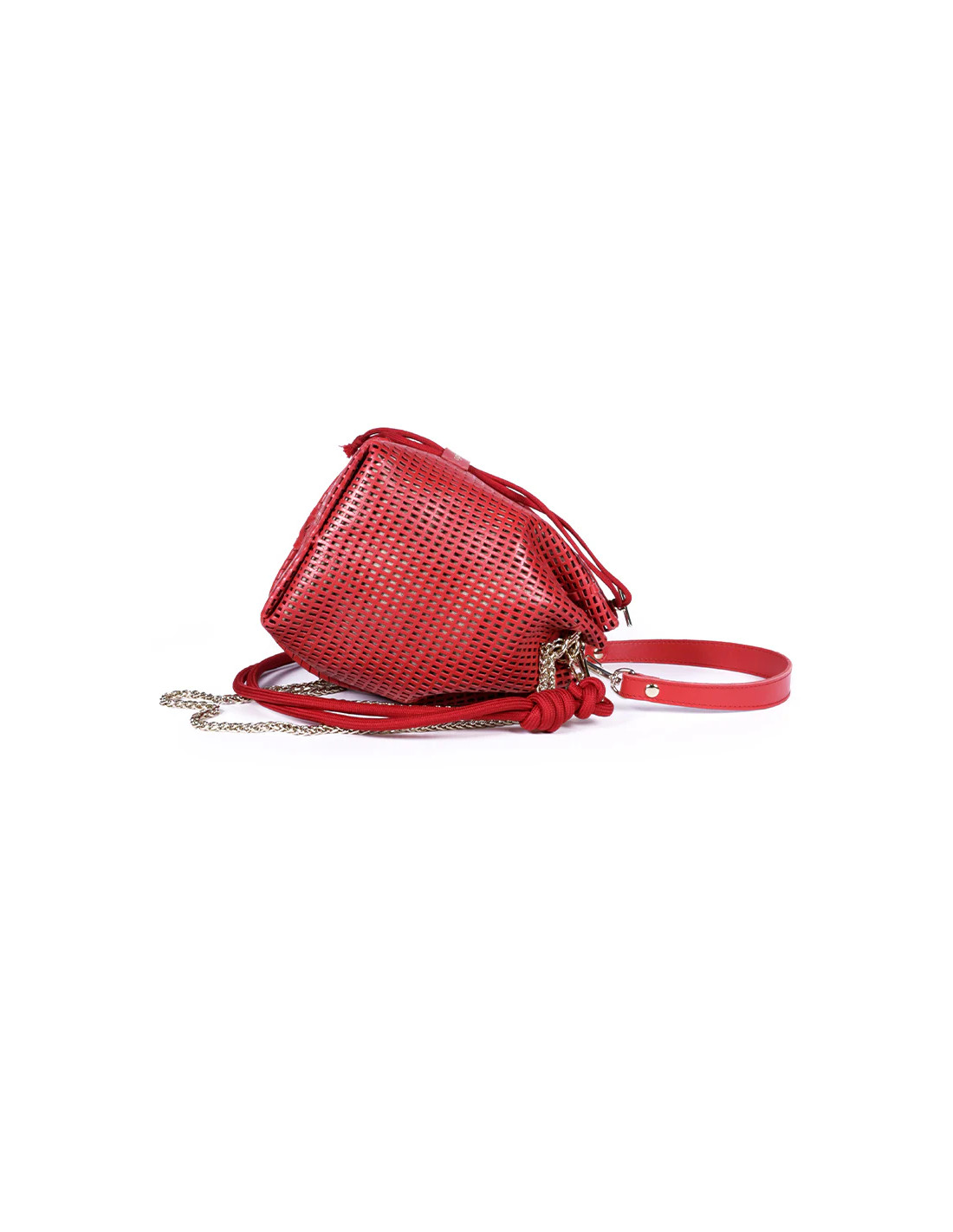 Mini sac seau en cuir de veau perforé rouge cousu main et doublé en coton bio