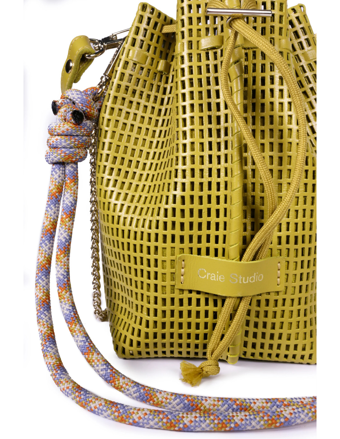 Mini sac seau en cuir de veau perforé jaune moutarde cousu main doublé en coton bio