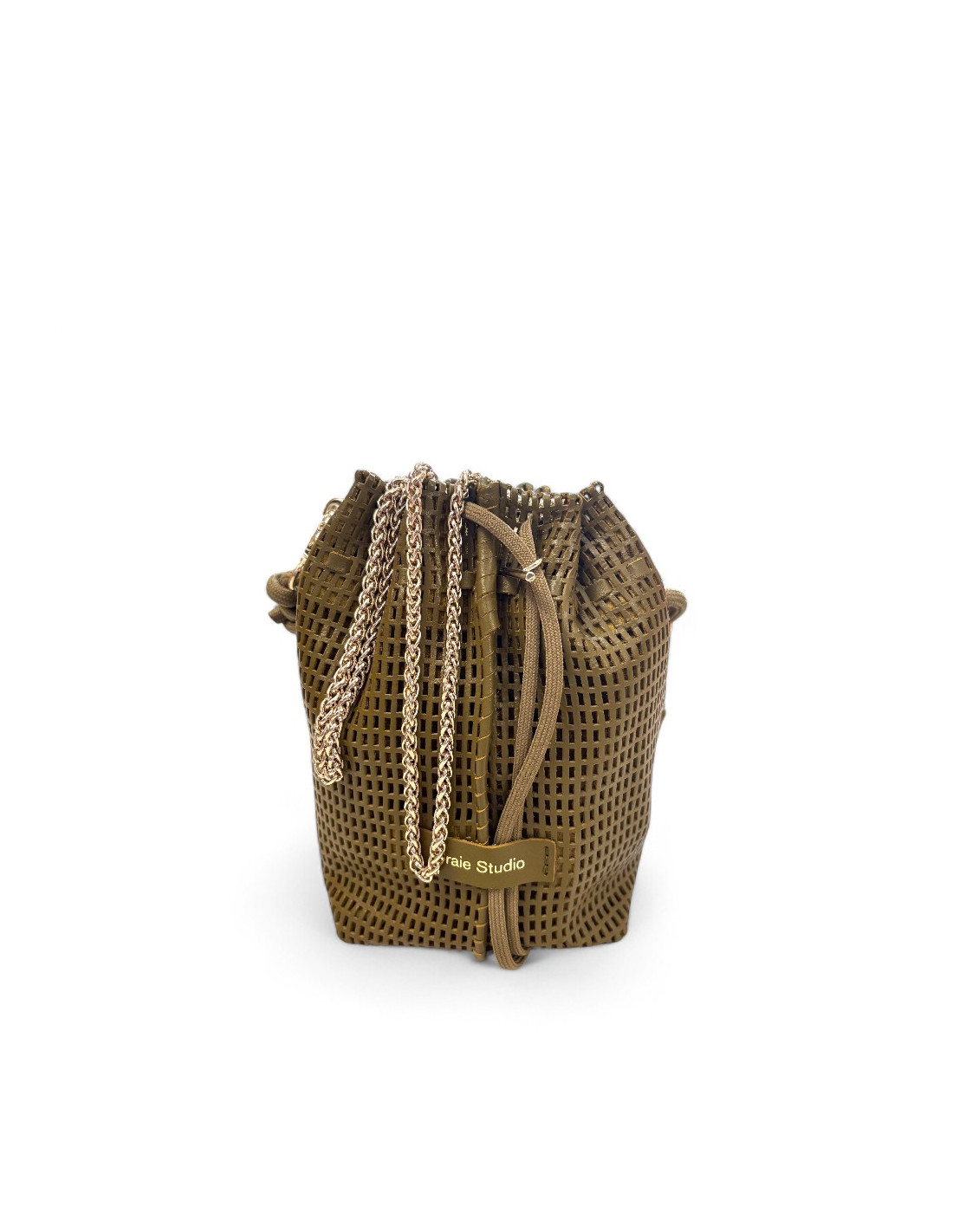 Mini sac seau en cuir d'agneau perforé kaki cousu main