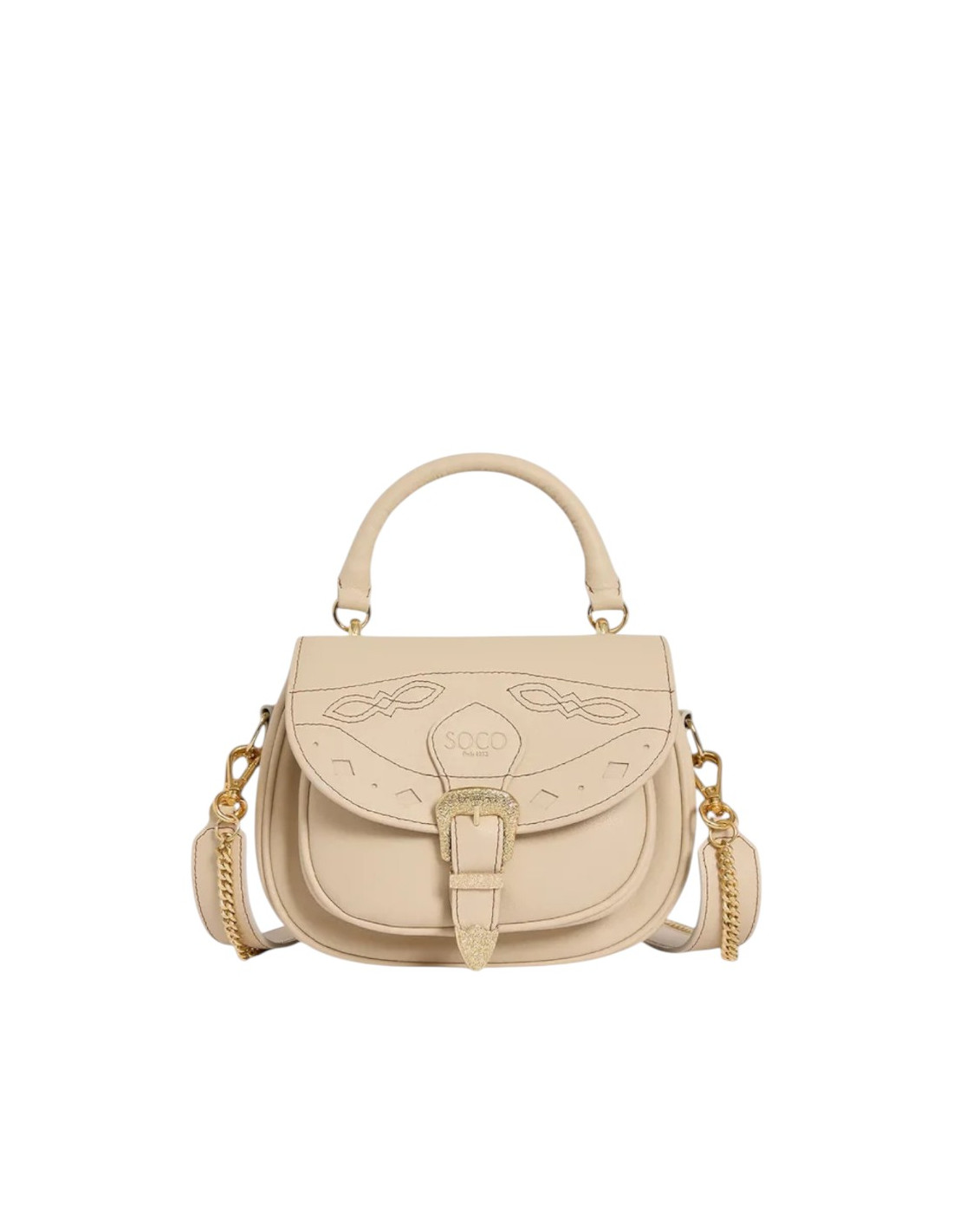 Porté main grâce à sa poignée structurée, épaule ou crossbody grâce à sa bandoulière et sa chaîne amovibles