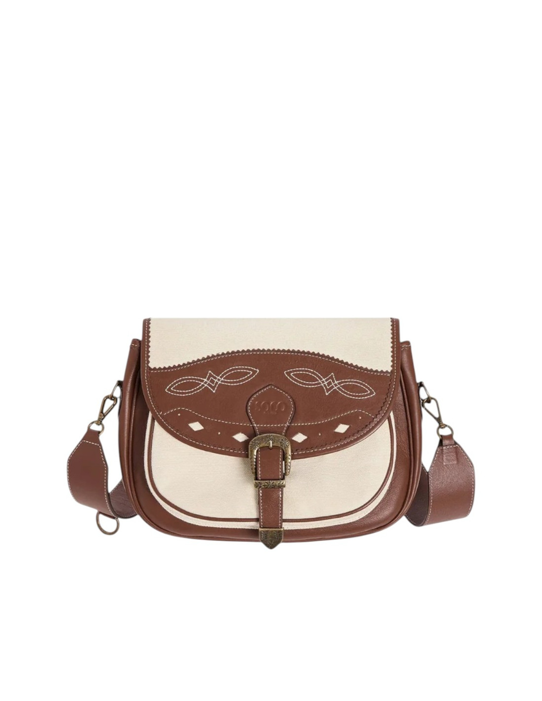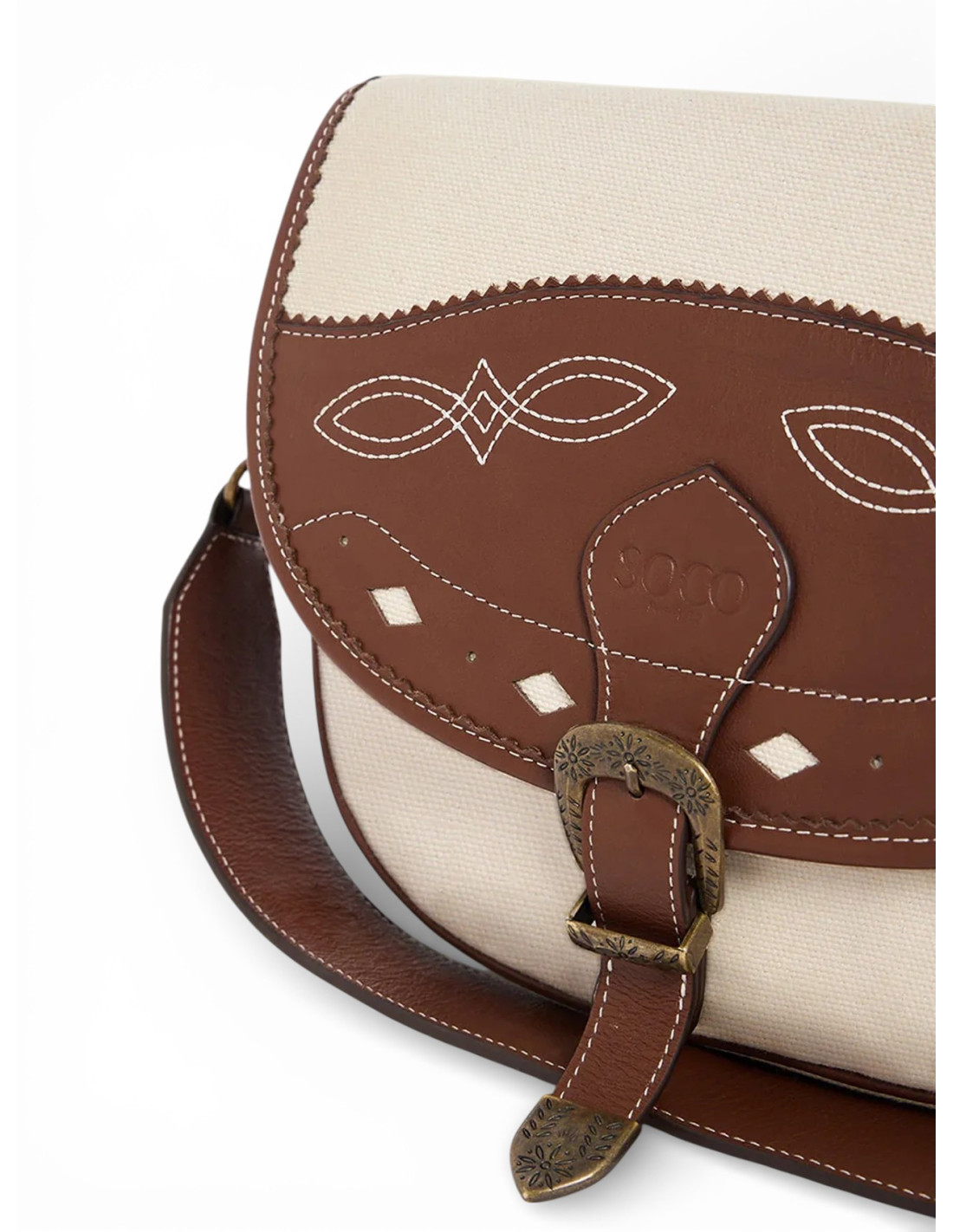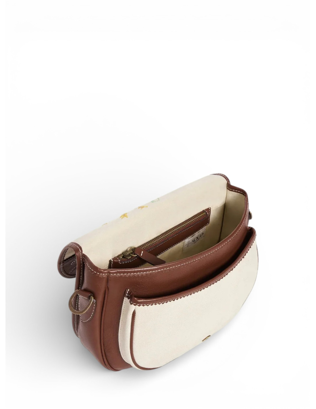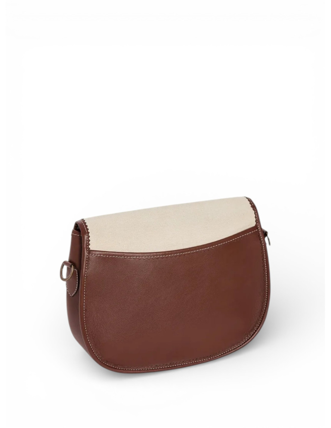 Sac besace en cuir lisse de bovin chataigne et toile canvas blanc naturel