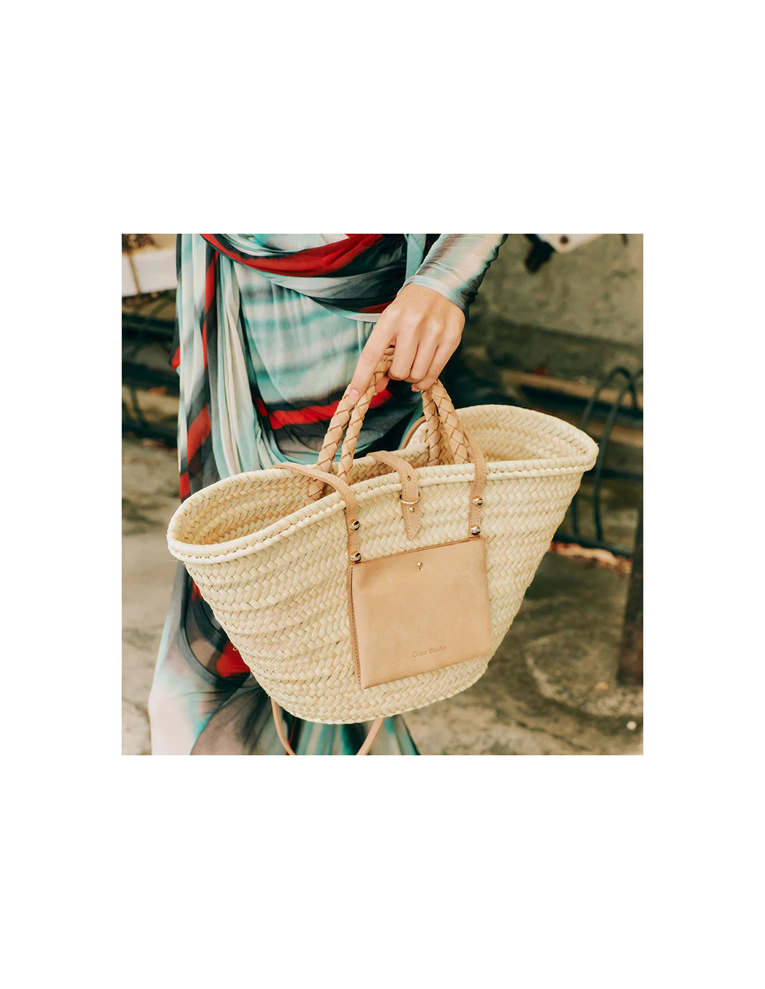 Poignées courtes tressées à la main et large poche volante à l'avant du panier