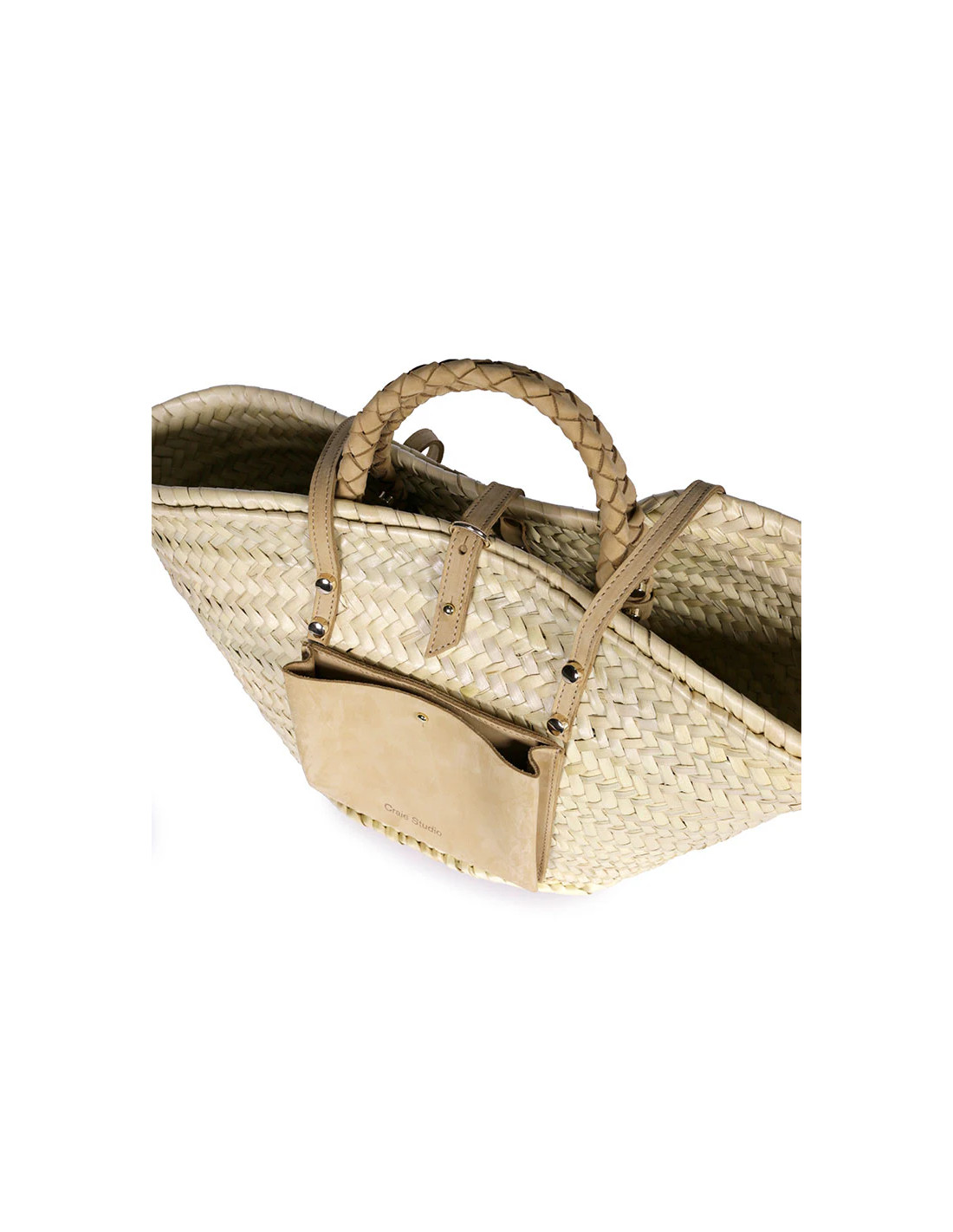 Panier en fibre naturelle de palmier et cuir nubuck beige sand