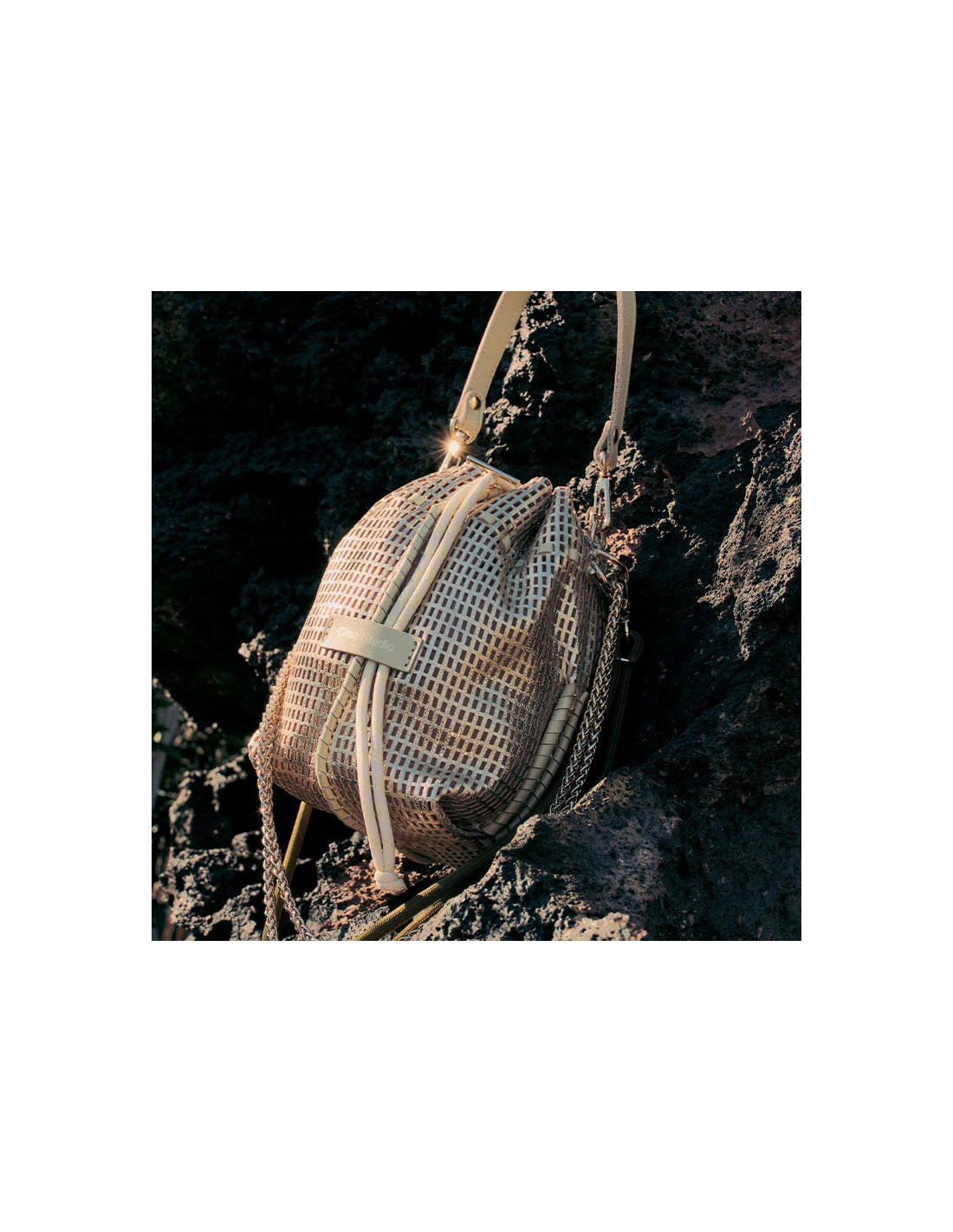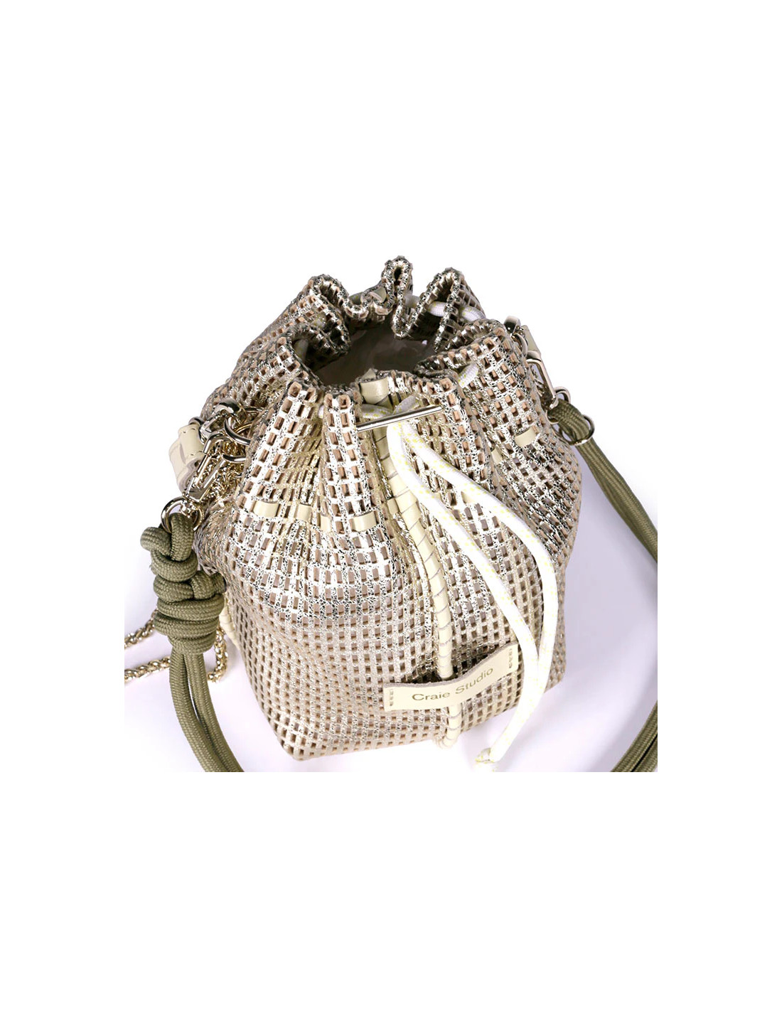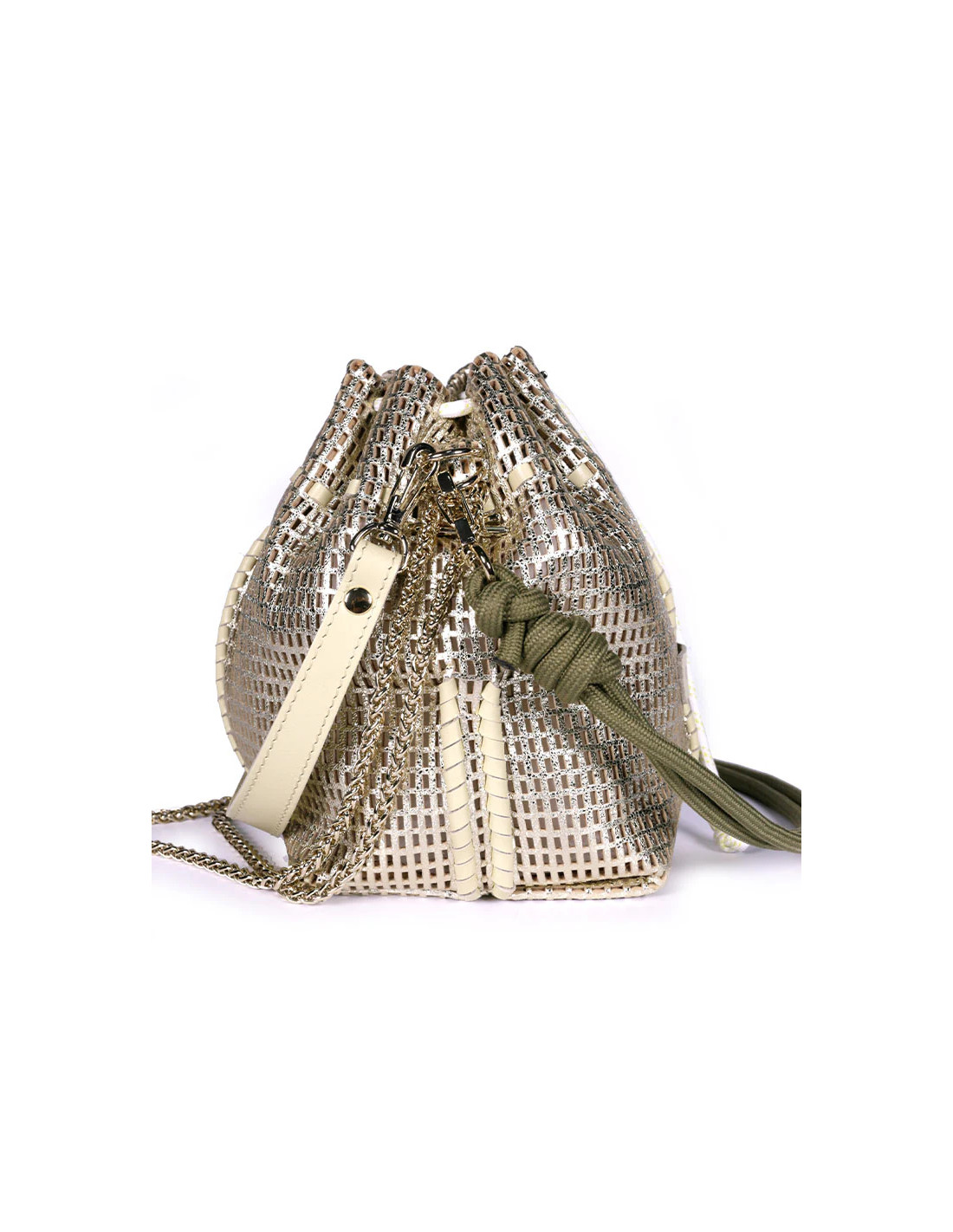 Mini sac seau en cuir d'agneau perforé or champagne cousu main