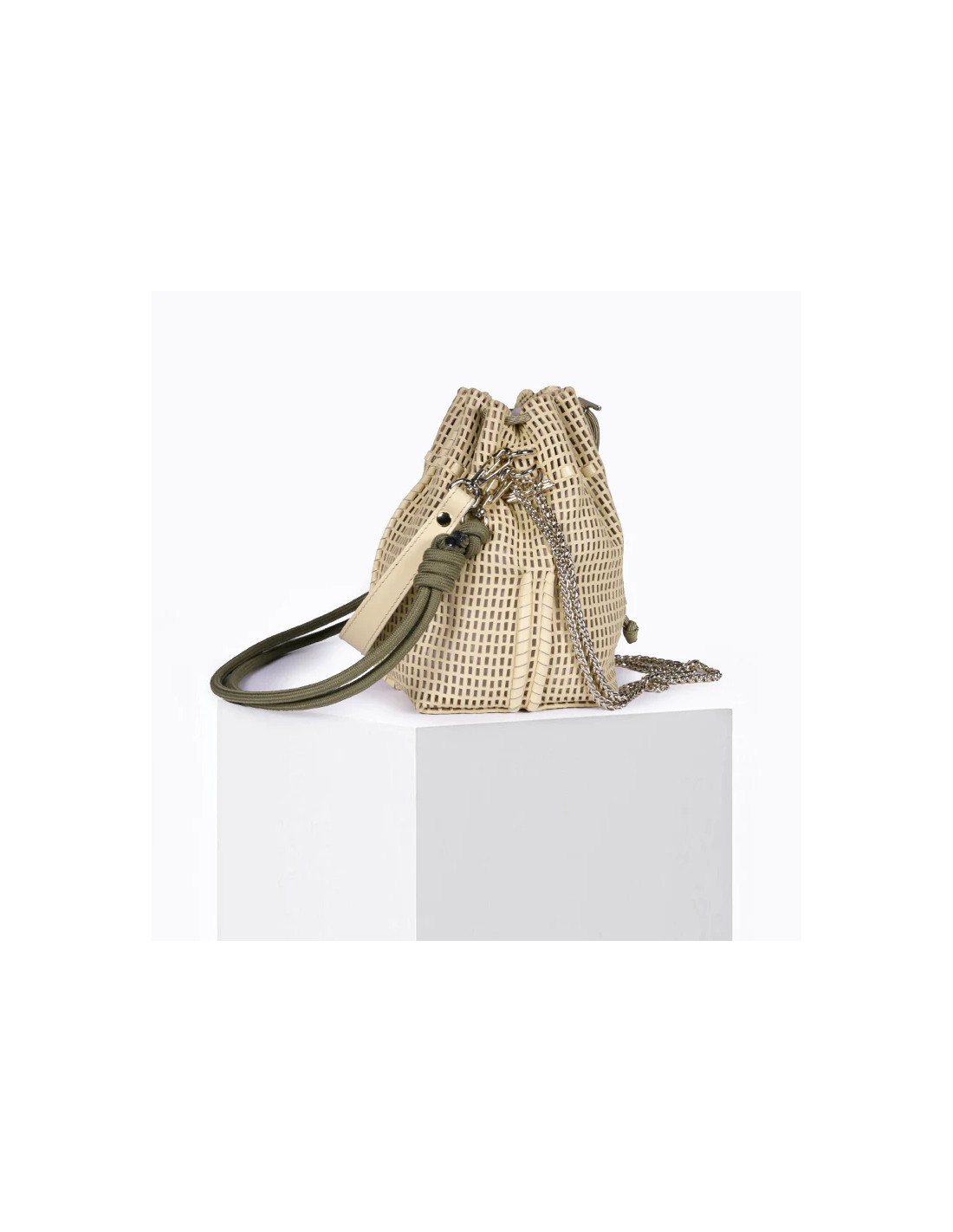 Mini sac seau en cuir d'agneau perforé vanille cousu main