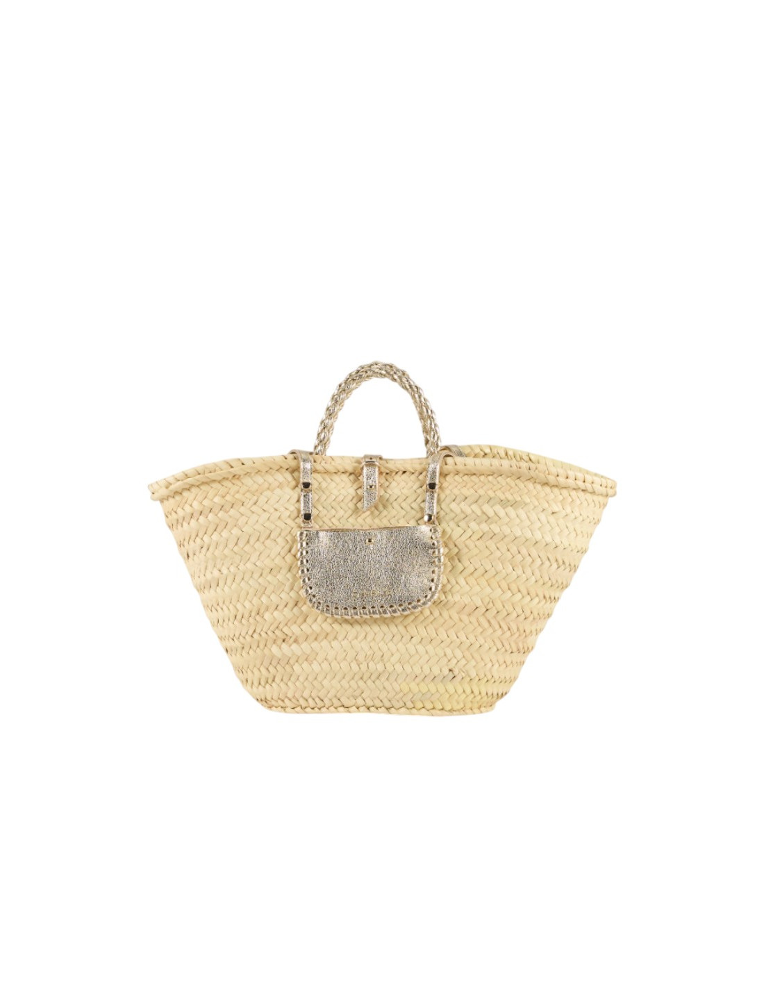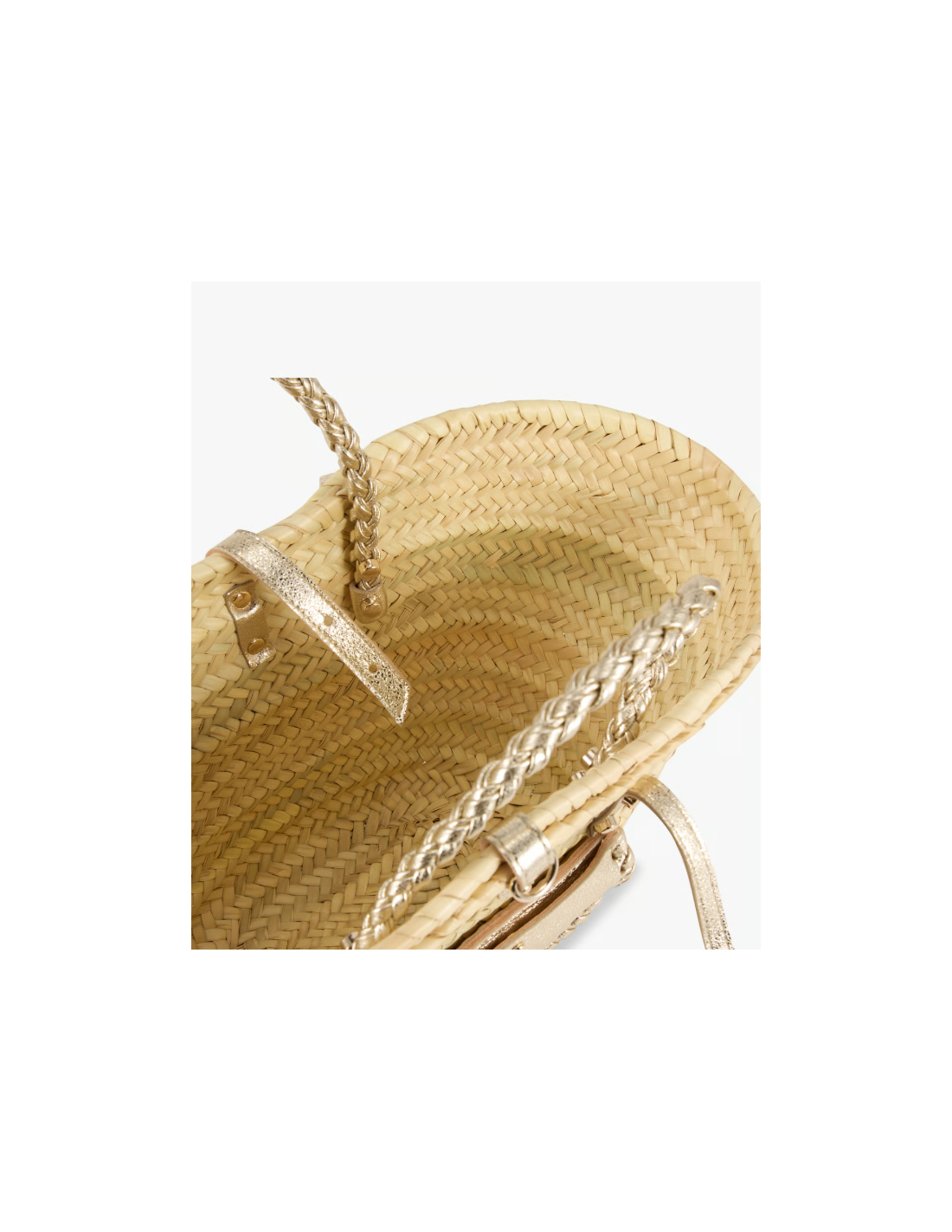 Panier tressé à la main en fibre naturelle de palmier avec cuir doré champagne